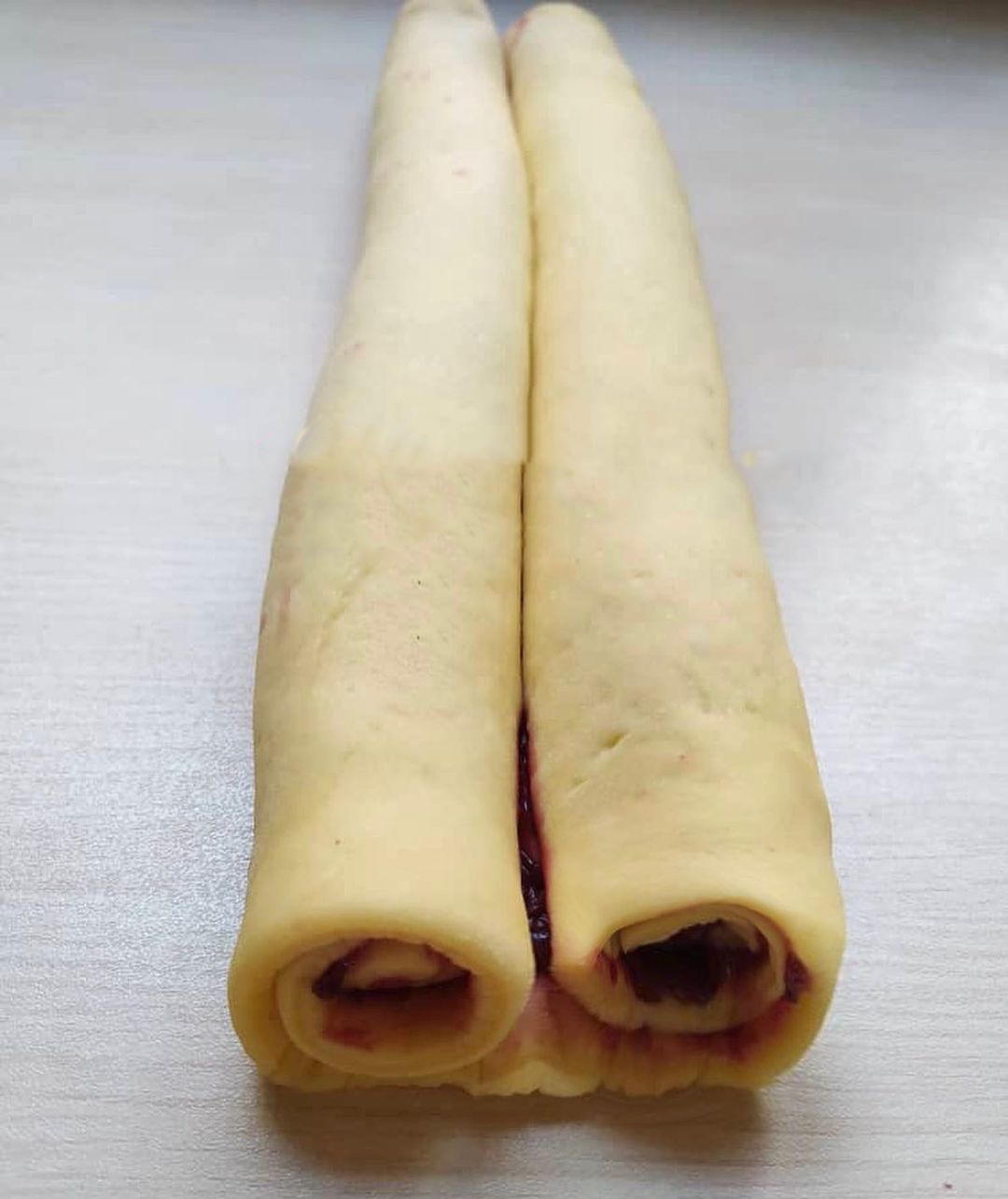 در ادامه وفتی حجم خمیر دو برابر شد باید پف آن را با مشت بگیرید. حالا خمیر را روی سطح آردپاشی شده به صورت مستطیل باز کنید. دور تا دور خمیر را با کاتر مرتب کنید. حالا مارمالاد دلخواه خود را روی خمیر بزنید. سپس خمیر را همانند تصویر از دو طرف لوله کنید و به وسط بیاورید.