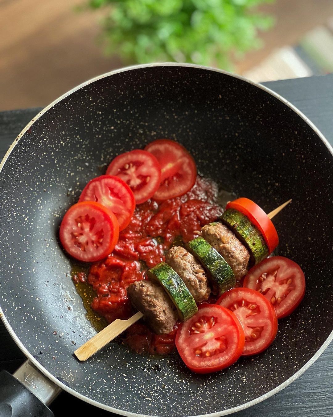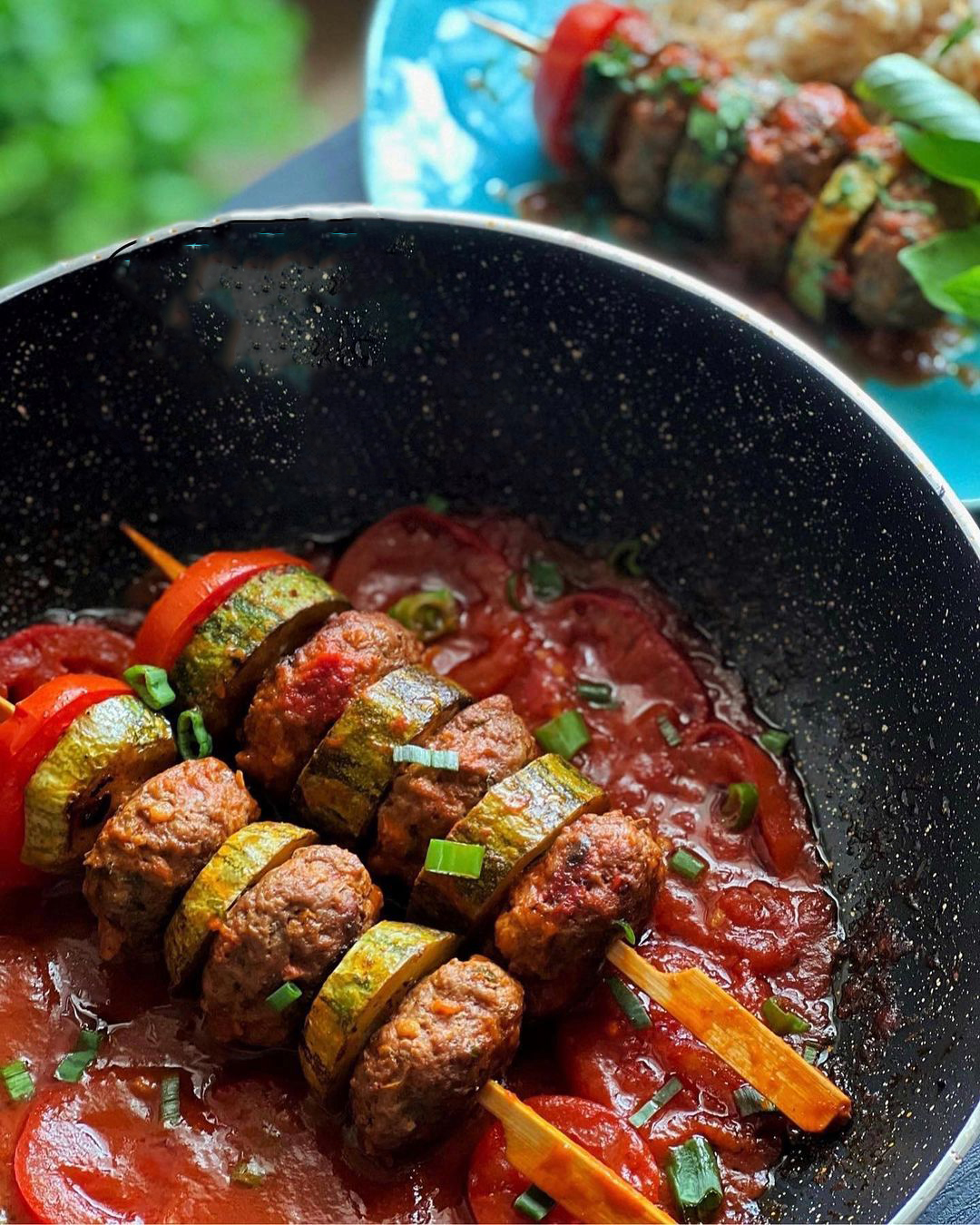 حالا یک سیخ چوبی بردارید و به ترتیب یک کباب و یک کدو سرخ شده روی آن بزنید و داخل سس در حال جوش قرار دهید. به دلخواه می توانید انتهای هر سیخ کمی گوجه حلقه شده نیز قرار دهید. حالا اجازه دهید با حرارت ملایم جا افتاده و سس غلیظ شود.