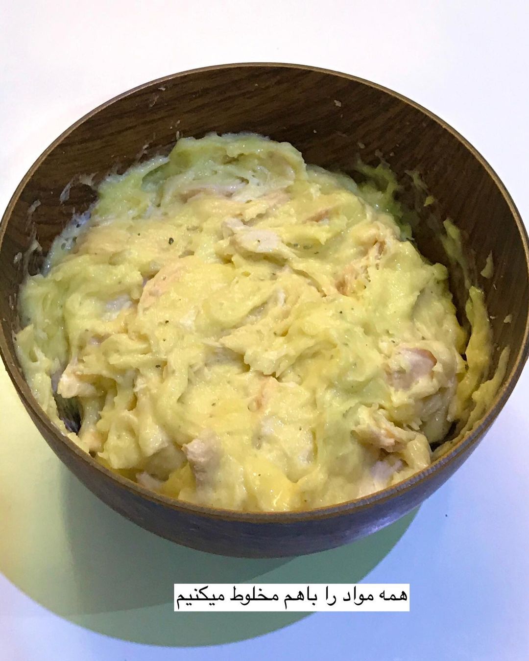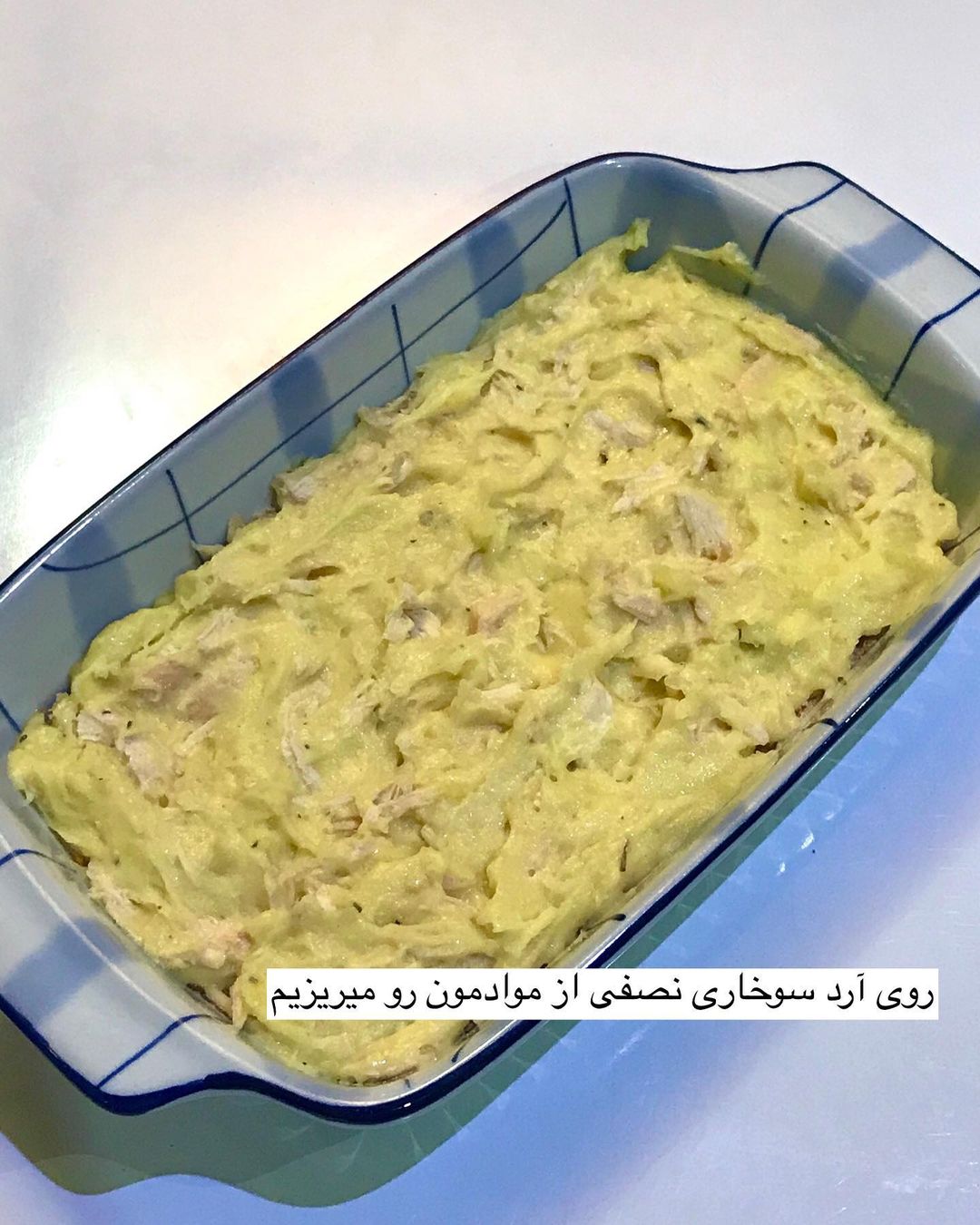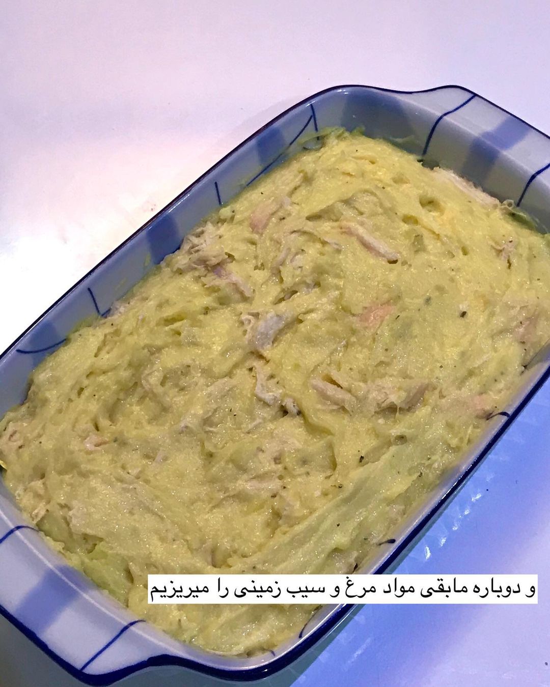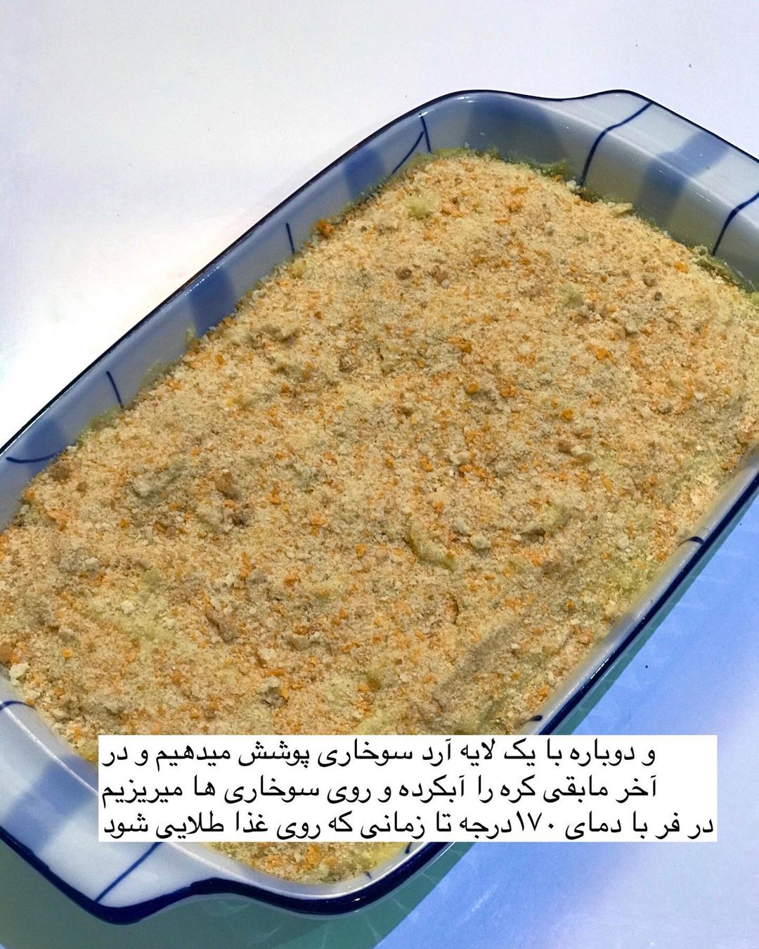 در ادامه مجدد روی پنیر مواد سیب زمینی را بریزید و دوباره یک لایه پودر سوخاری روی مواد بریزید و در آخر روی مواد کره آب شده بریزید و در فر از قبل گرم شده به مدت ۱۵ دقیقه در دمای ۱۷۰ قرار دهید تا کاملا برشته و طلایی شود. سپس به همراه سس دلخواه خود سرو کنید. نوش جان