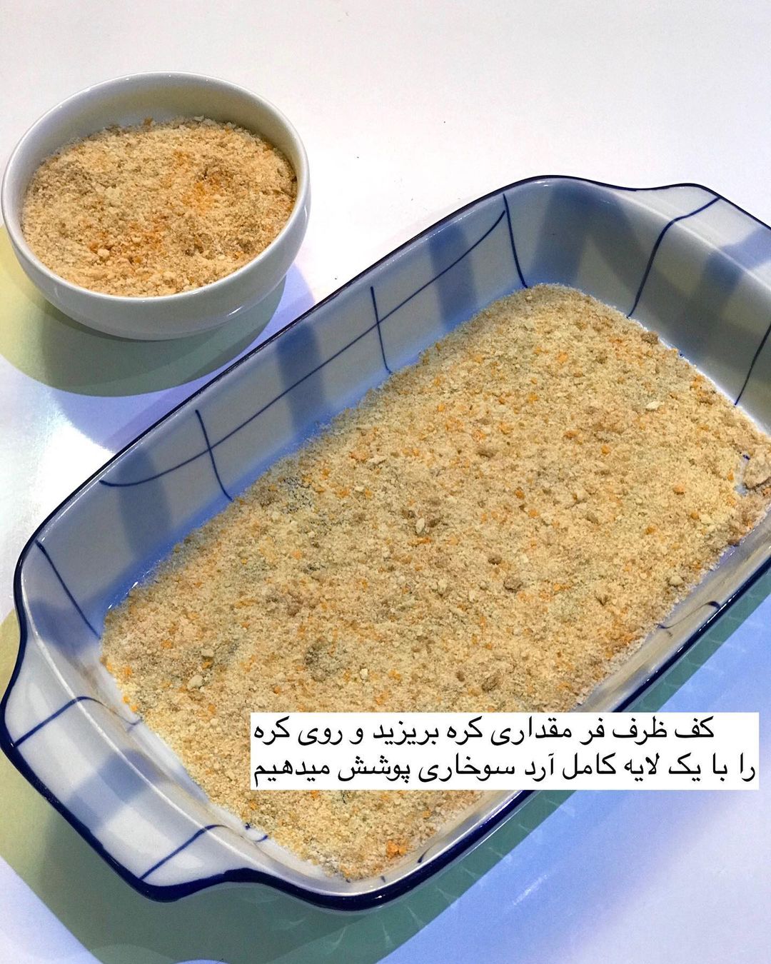 در ادامه ظرف مناسب فر را انتخاب کنید و کف ظرف مورد نظر را کمی با کره چرب کنید و روی آن پودر سوخاری دلخواه خود را بریزید و بعد روی آرد سوخاری نیمی از مواد مخلوط شده مرحله قبل را روی پودر سوخاری بریزید و سطح آن را صاف کنید در ادامه روی مواد پنیر پیتزا یا ورقه ای قرار دهید.