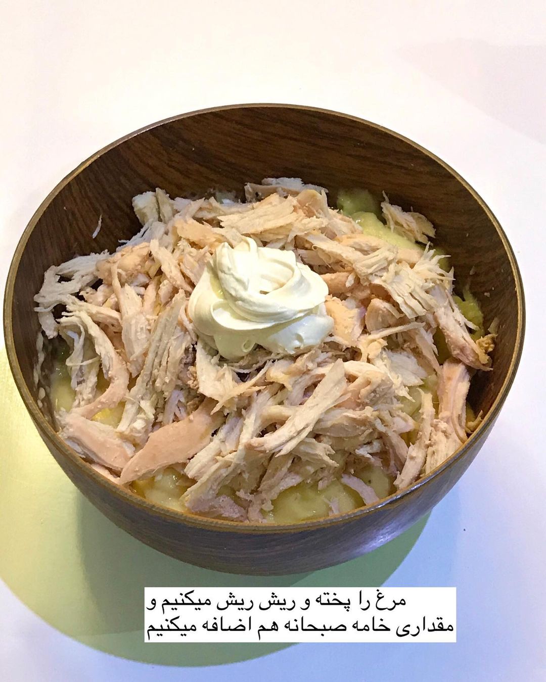 در ادامه مرغ را از قابلمه خارج و ریش ریش کنید و کنار بگذارید. حالا داخل مرغ را به همراه تخم مرغ و به کاسه سیب زمینی اضافه کنید و بعد خامه و کره ای به دمای محیط رسیده و نرم شده را به همراه ادویه ها به مواد اضافه کنید و مواد را خوب مخلوط کنید تا یکدست شود.