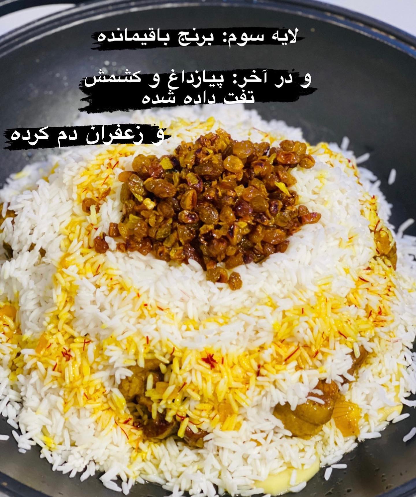 - می توانید ته چین را به صورت قالبی در بیاورید و در انتها با مخلوط کشمش و زرشک تزئین کنید.