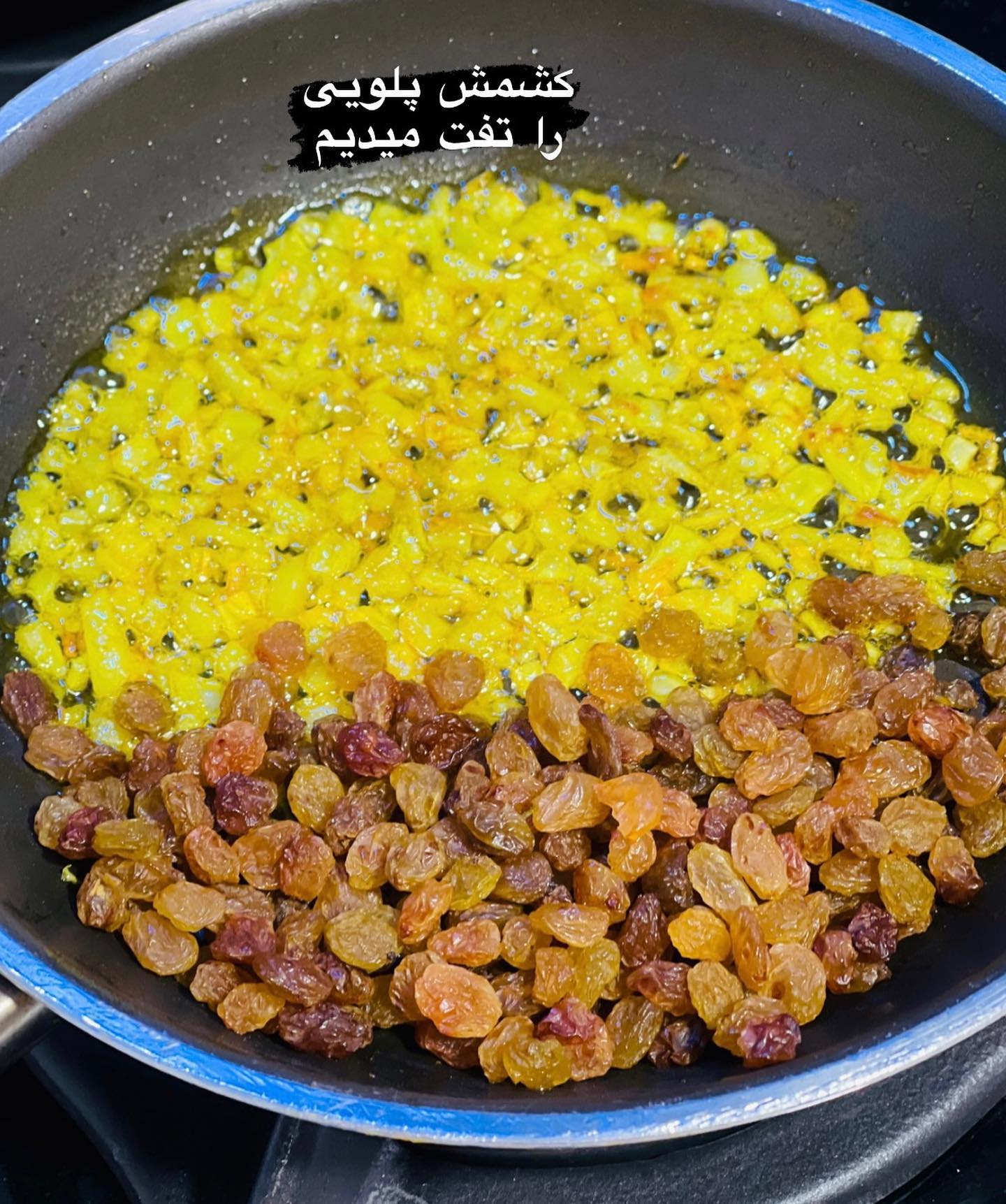 پیاز باقی مانده را پوست بگیرید و خرد کنید و داخل تابه با کمی زردچوبه تفت دهید تا سبک شد. کشمش پلویی را پاک کنید و به دلخواه کمی خیس کنید تا نرم شود. سپس به همراه پیاز داغ تفت دهید تا کشمش ها پف کنند و نرم شوند. برنج از قبل خیس کرده را روی حرارت قرار دهید تا کم کم بجوش بیاید.