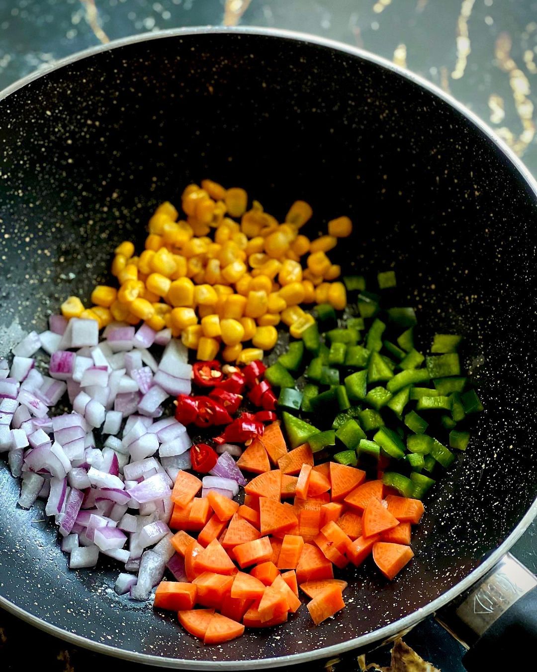ابتد پیاز را پوست بگیرید و بشورید و بعد به صورت مکعبی یا نگینی ریز خرد کنید. فلفل دلمه را شسته و به صورت ریز خرد کنید. هویج را پوست بگیرید و مکعبی ریز خرد کنید. فلفل چیلی را نیز شسته و حلقه ای خرد کنید. استفاده از فلفل چیلی اختیاری می باشد ولی طعمی فوق العاده به این کوکو خواهد داد. ذرت را بخارپز کنید و یا از کنسرو آن استفاده کنید.