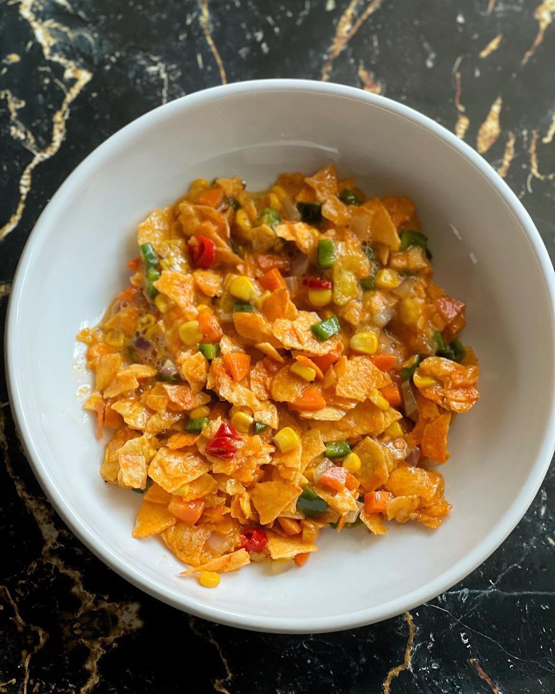 در ادامه پیاز را داخل تابه بریزید و کمی تفت دهید تا سبک و شیشه ای شود و در ادامه سبزیجات خرد شده را اضافه کنید و کمی تفت دهید تا نرم شوند. چیپس را با دست به اندازه دلخواه خرد کنید و داخل یک کاسه بریزید و سبزیجات تفت داده را که کاملا خنک شده به آن اضافه کنید و هم بزنید.