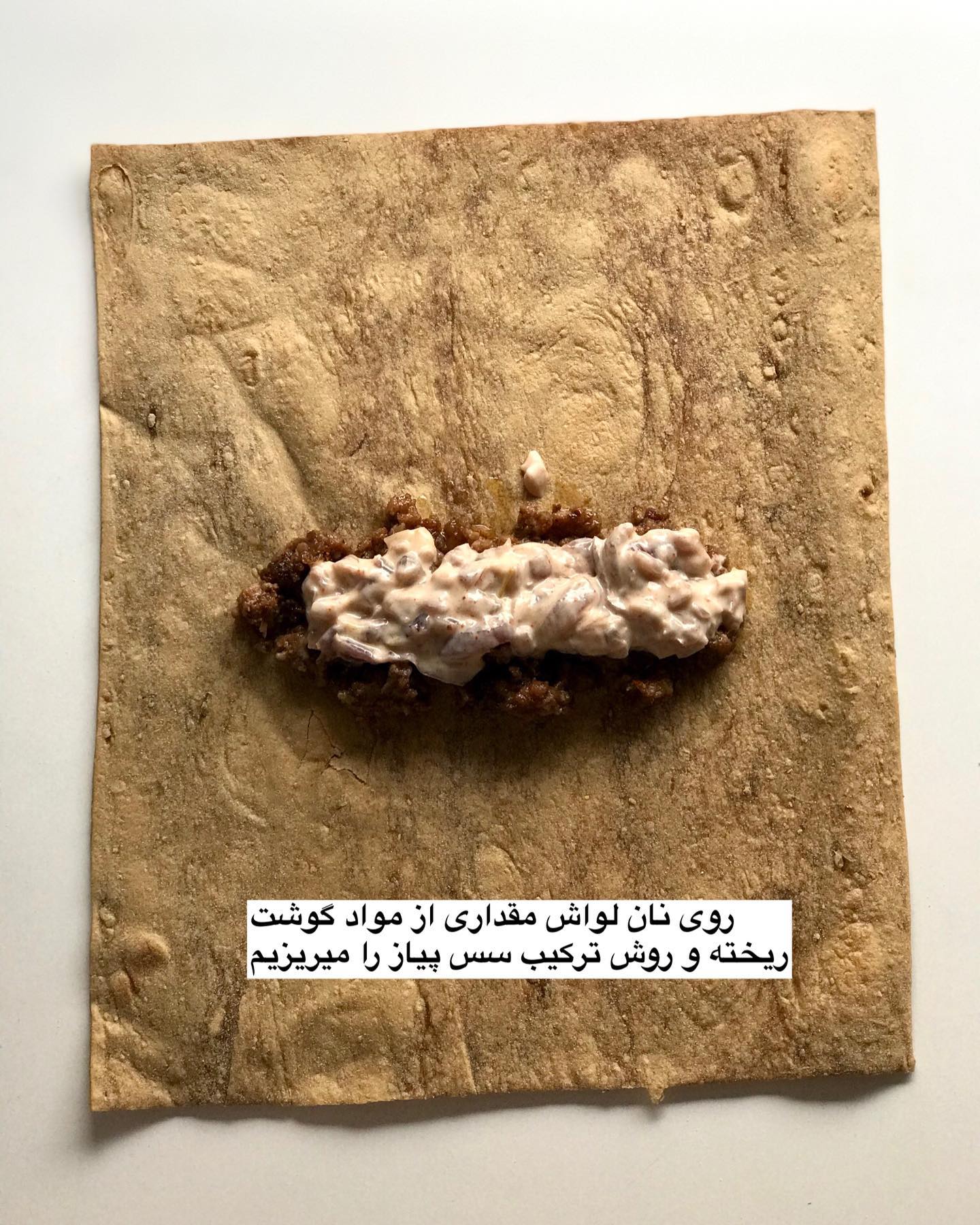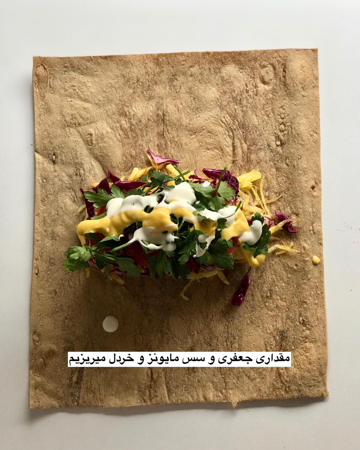 در ادامه روی نان لواش مقداری مواد گوشتی ریخته و بعد ترکیب سس پیاز را بریزید و بعد سیب زمینی سرخ شده و کلم خرد شده و گوجه را اضافه کنید و در انتها کمی جعفری و سس مایونز و خردل بریزید و نان را رول کنید. نوش جان
