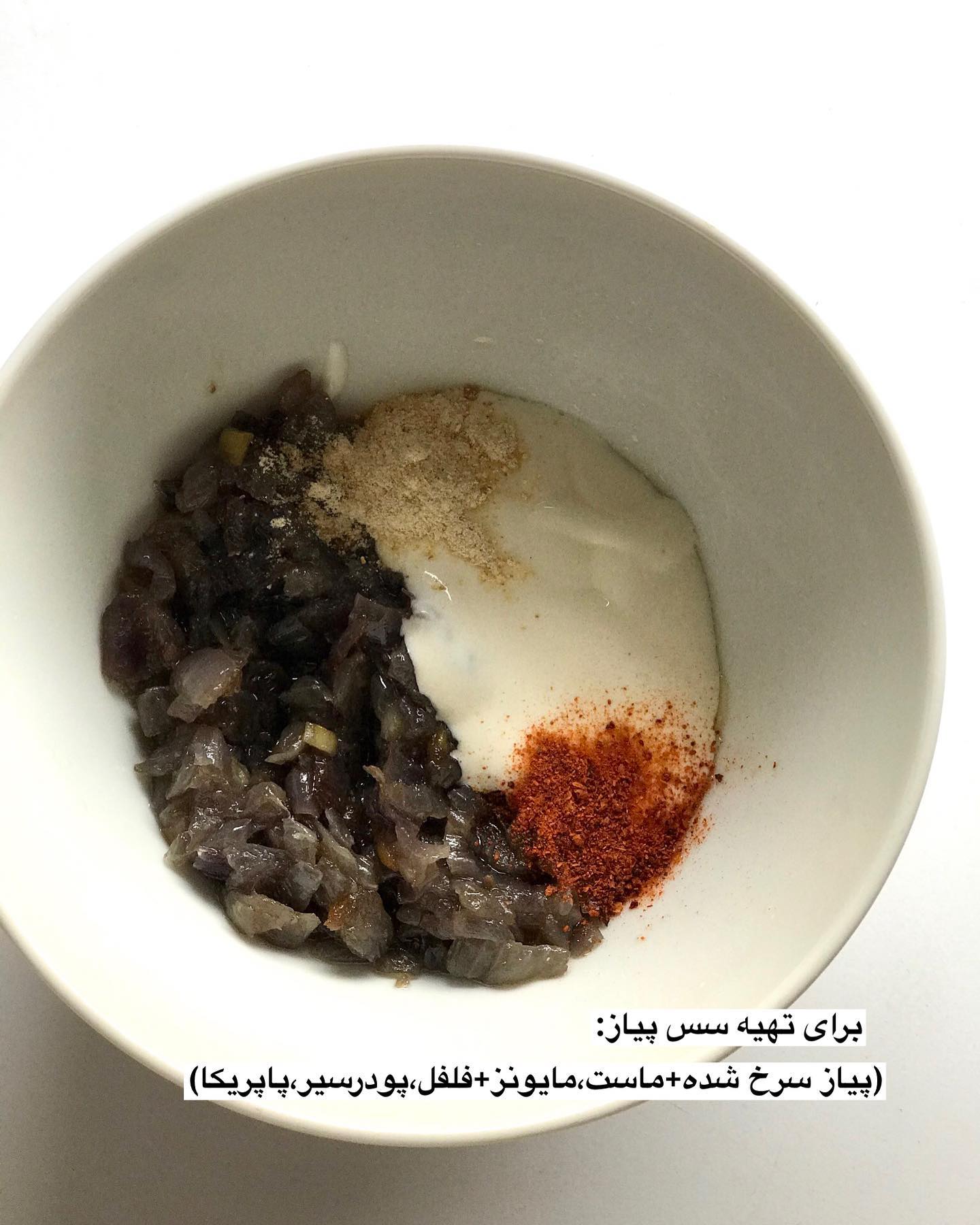 در ادامه برای تهیه سس پیاز باید یکی از پیازهای باقی مانده را به صورت خلالی ریز خرد کنید و داخل تابه کمی تفت دهید تا از خامی خارج شود و بعد شروع کنید ذره ذره آب اضافه کنید و هم بزنید تا پیاز کاراملی شود. پیاز را داخل کاسه ریخته و کمی ماست و سس مایونز و فلفل سیاه و پودر سیر و پاپریکا خوب هم بزنید.