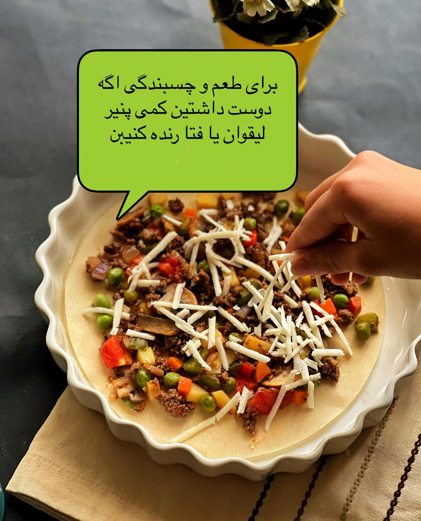در ادامه خمیر یوفکا را از بسته خارج کنید. ظرف مورد نظر را که می توانید از یک ظرف گرد یا مستطیل که قابلیت فر دارد را انتخاب کنید و با کمی روغن زیتون چرب کنید و بعد دو لایه از خمیر یوفکا اضافه کنید و کمی مواد گوشتی و به دلخواه پنیر پیتزا بریزید.
