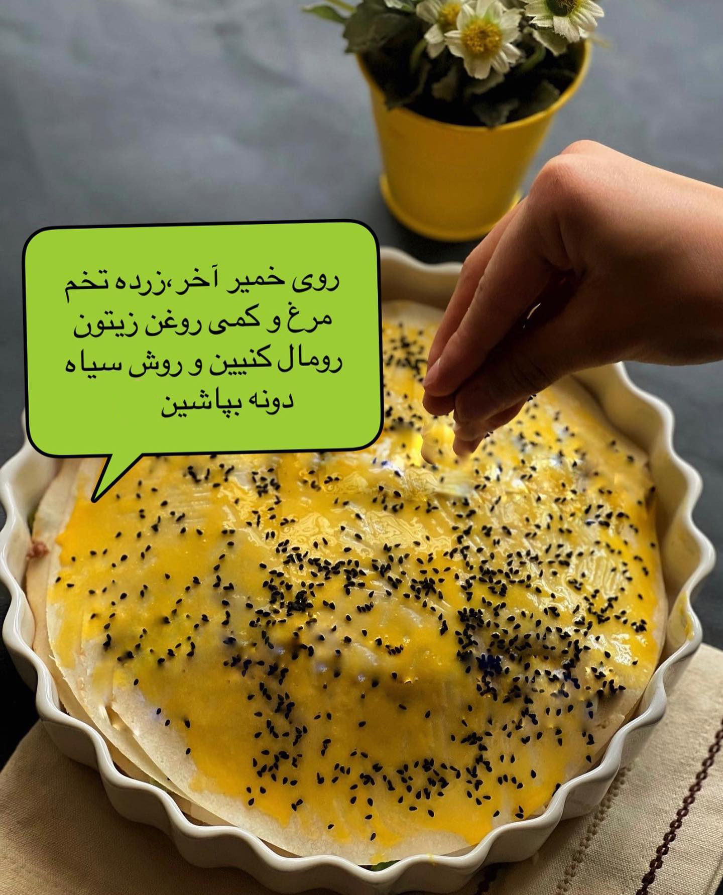 در ادامه باید همین طور لایه ها را تکرار کنید تا مواد تمام و ظرف پر شود. در انتها روی خمیر را با یک زرده زرده شده با کمی روغن زیتون خوب رومال کنید و بعد روی خمیر سیاه دانه بریزید و بعد ظرف را در فر از قبل گرم شده به مدت ۱۵ دقیقه در دمای ۱۸۰ درجه قرار دهید تا باقلوا گوشت پخته شود. نوش جان