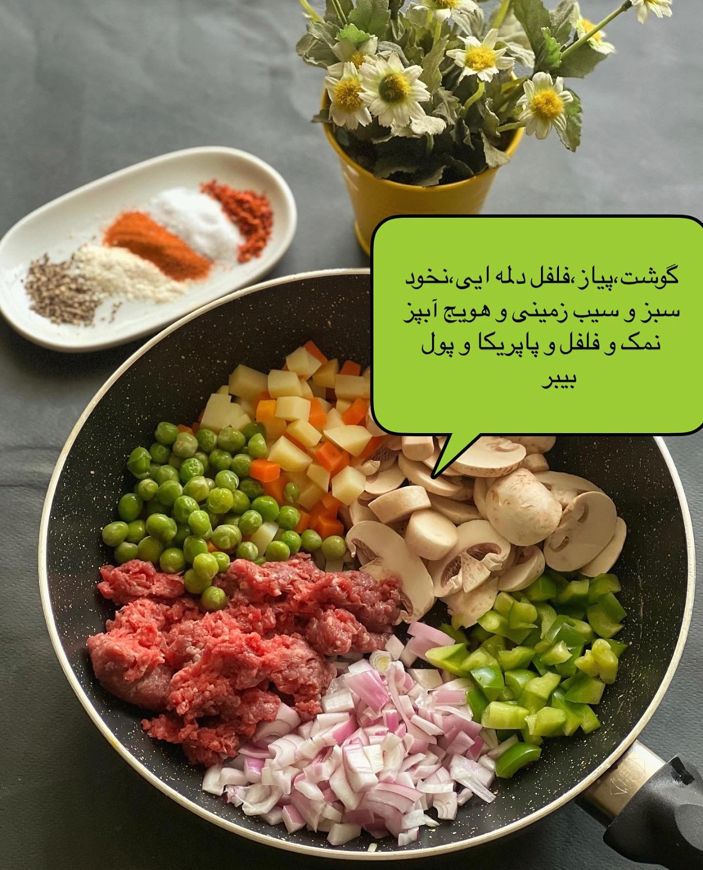 در ادامه باید سیب زمینی و هویج را پوست بگیرید و به صورت مکعبی ریز خرد کنید و با کمی آب از قبل آبپز کنید و به همراه نخود فرنگی و قارچ اسلایس شده و فلفل دلمه خرد شده را اضافه کنید و همه مواد را باهم تفت دهید تا سبزیجات نرم شود.