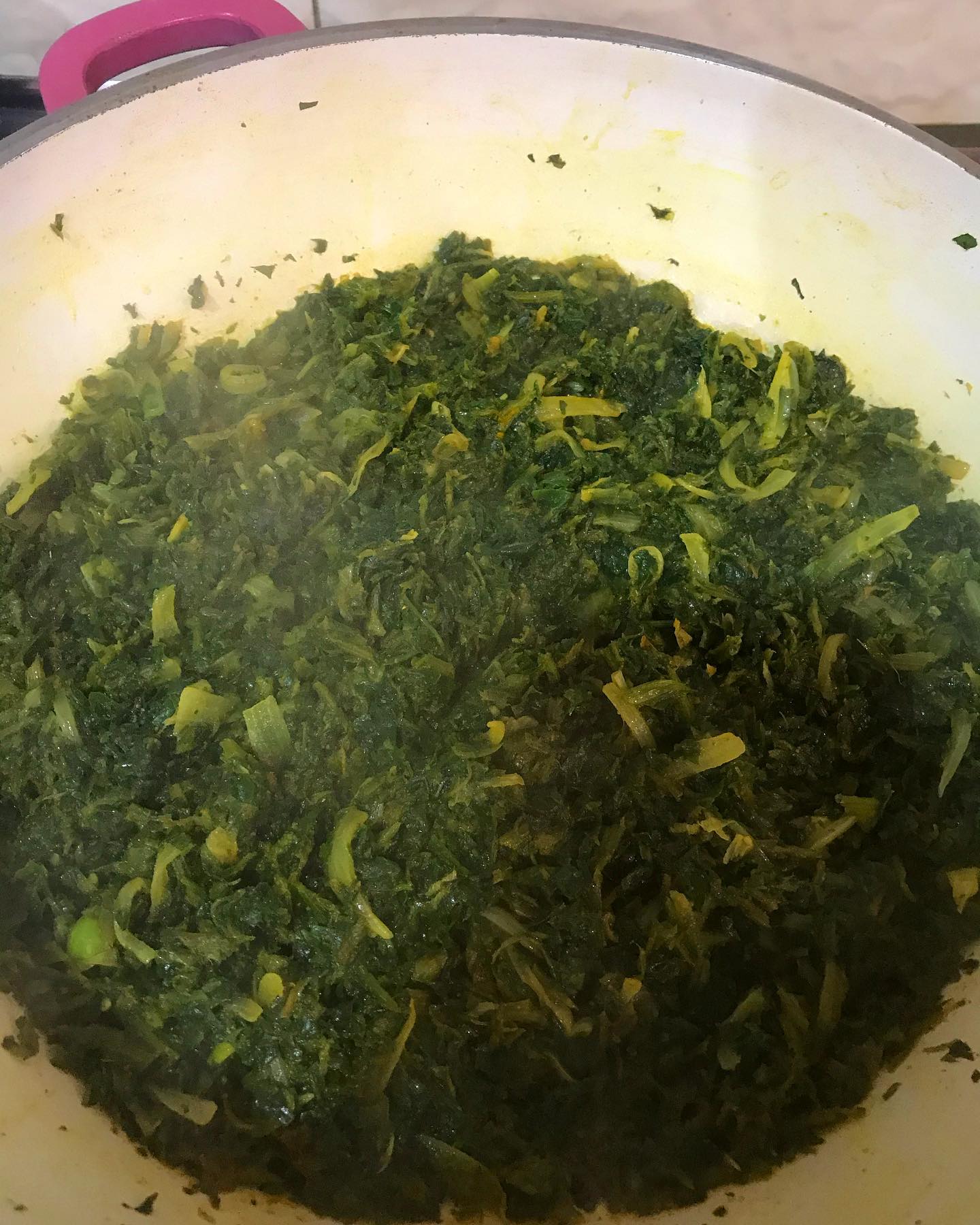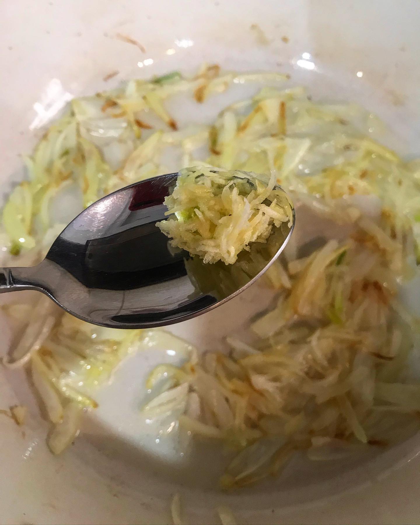 در ادامه پیاز را پوست بکیرید و نگینی ریز خرد کنید و داخل تابه با کمی زردچوبه تفت دهید تا سبک و کمی طلایی شود. سیر را پوست بگیرید و رنده ریز و به همراه پیاز تفت دهید تا عطر سیر بلند شود. در ادامه اسفناج پاک شده و خرد را به مواد اضافه کنید و خوب تفت دهید تا آب اضافی اسفناج کشیده و نرم شود. در ادامه قارچ اسلایس شده را اضافه کنید و تفت دهید تا قارچ نرم شود. تابه را از روی حرارت بردارید و کنار بگذارید.
