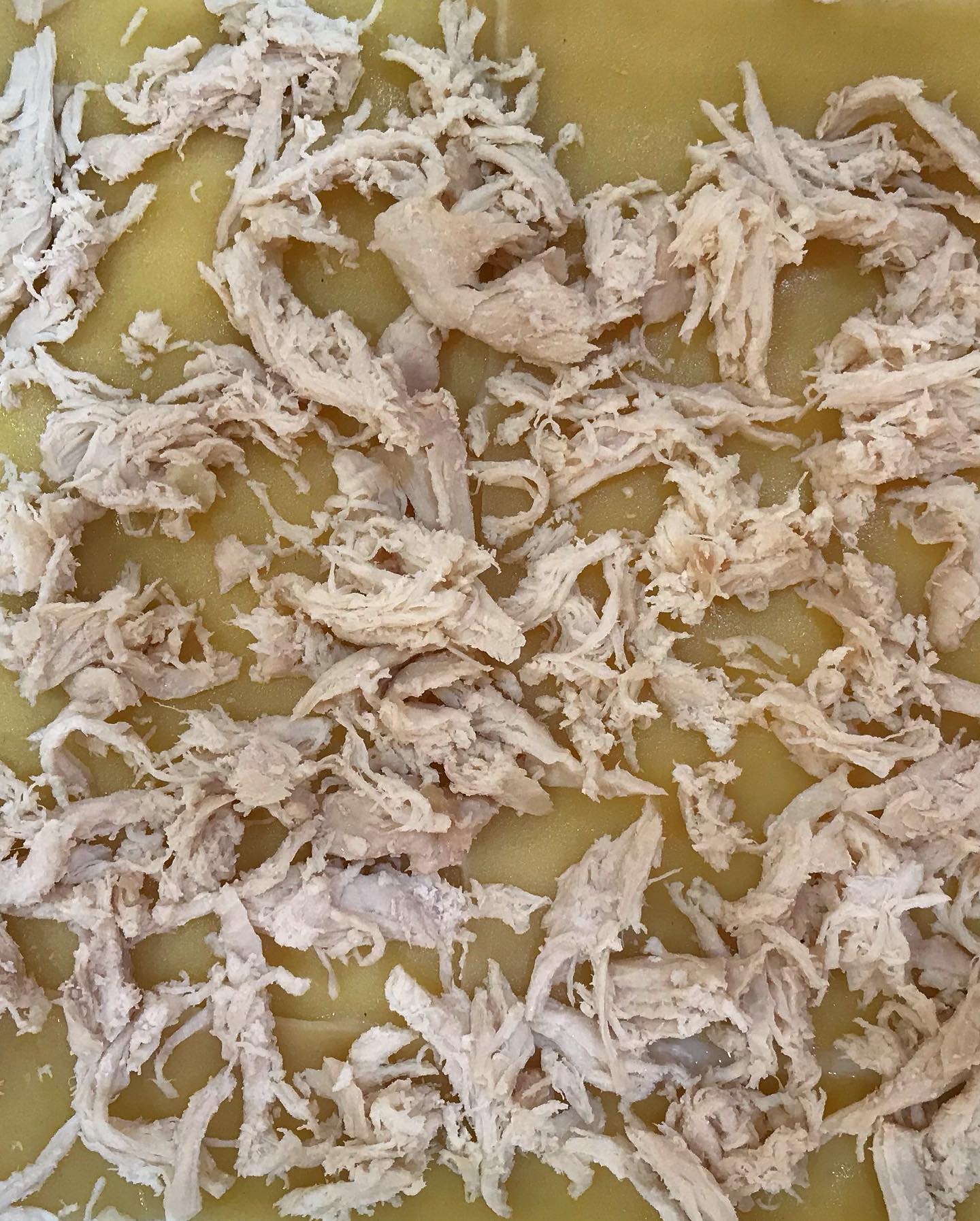 ابتدا سینه مرغ را با یک عدد پیاز و کمی و نمک و فلفل سیاه داخل قابلمه بریزید و مقداری آبجوش روی مرغ ریخته و بگذارید تا سینه مرغ را پخته شود. سینه مرغ را بعد از پخت از آب مرغ خارج و صبر کنید تا خنک شود. سپس مرغ را ریش ریش کنید.