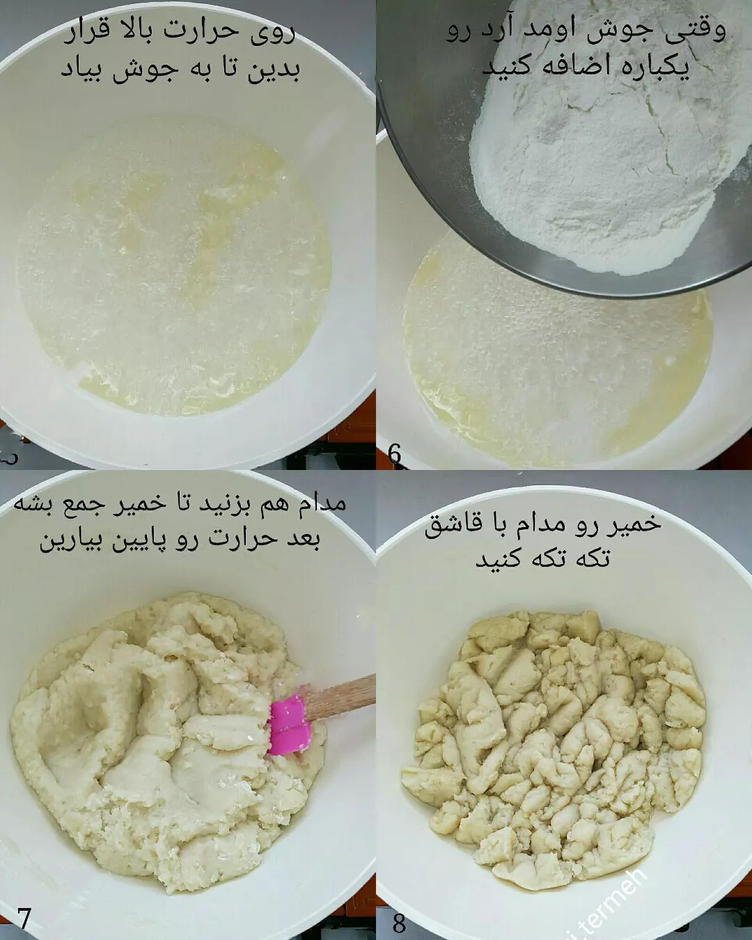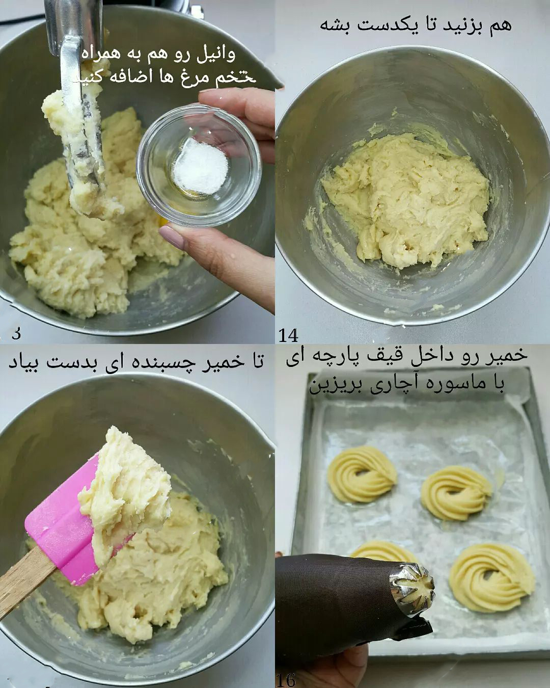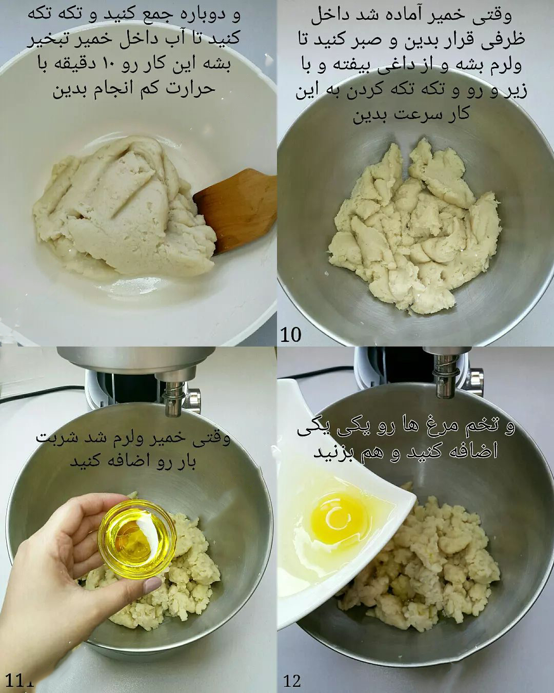 - اگر خمیر چسبنده نبود باید تخم مرغ ۵ را نیز اضافه کنید و این کاملا به سایز تخم مرغ ها نیز بستگی دارد.