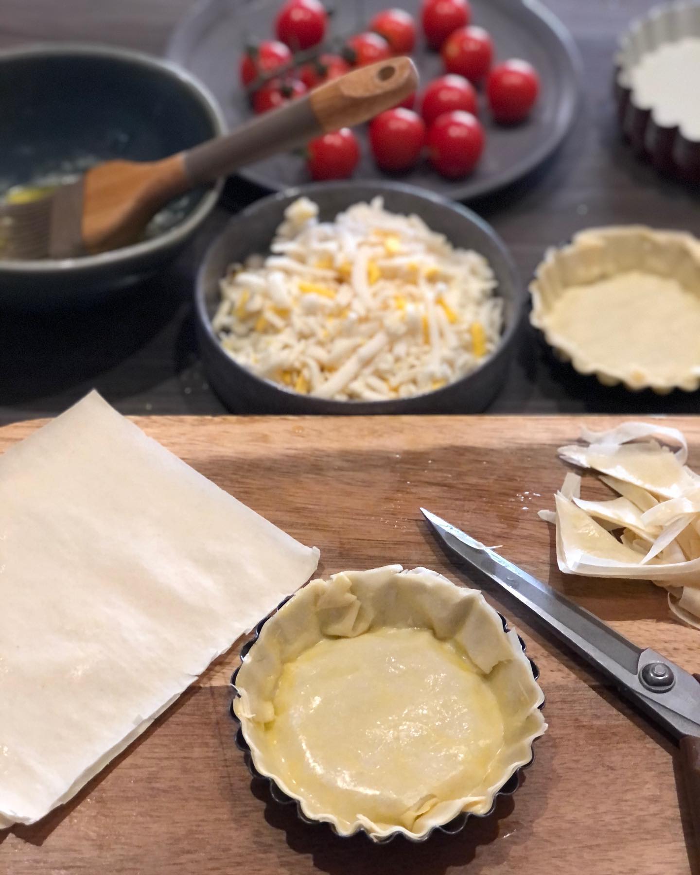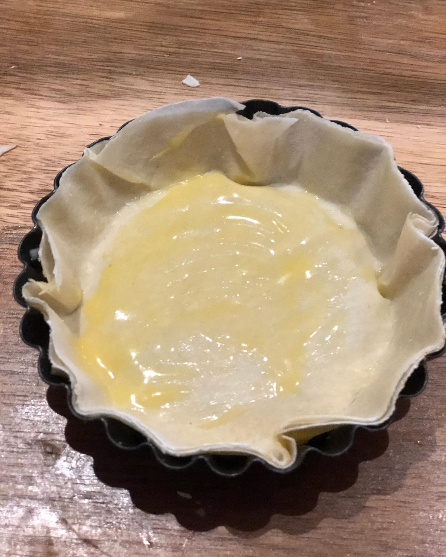 خمیر یوفکا یا فیلو را از بسته بندی خارج کنید و با قالب های به قطر ۱۲ سانتی متر انتخاب کنید. حالا ورقه های خمیر یوفکا را با کمک روغن مایع گفته شده خوب رومال کنید و داخل قالب قرار دهید. شما می توانید از یک قالب بزرگ استفاده کنید و یا از قالب های تارت کوچک استفاده کنید.