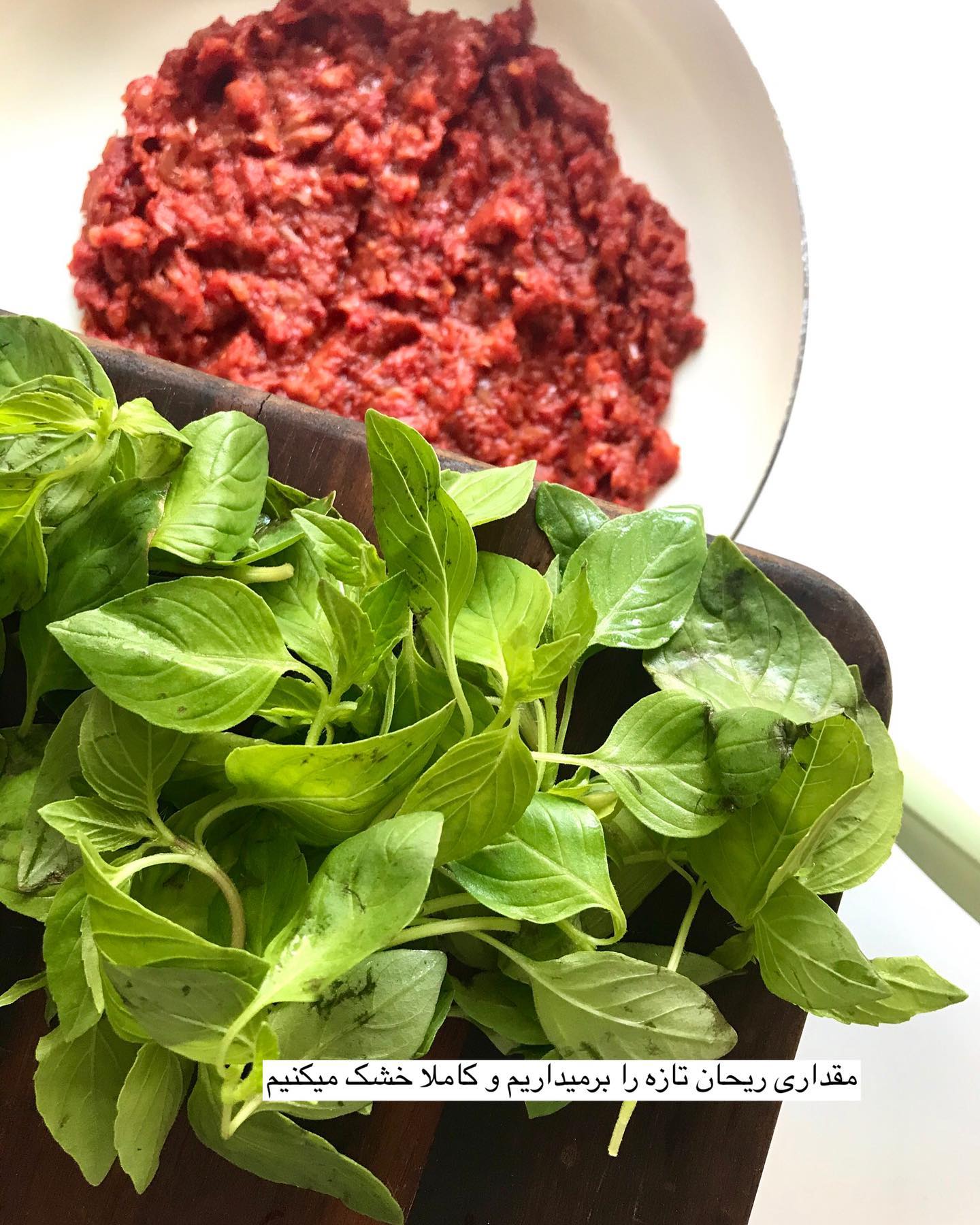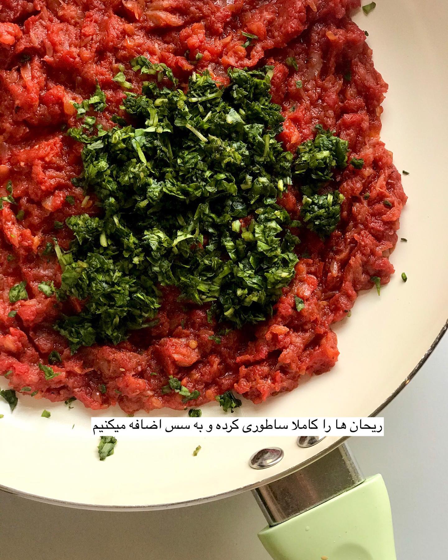 در ادامه سس را روی حرارت کم قرار دهید و برای ۲۰ دقیقه بگذارید تا پخته و غلیظ شود و در حین پخت به آن کمی نمک و آویشن بزنید. ریحان تازه را خرد کنید و به مواد سس اضافه کنید و بعد از چند دقیقه سس را از روی حرارت بردارید تا عطر ریحان از بین نرود. سپس گوشت را به سس ضافه کنید و روی شعله ملایم قرار دهید تا غلیظ و یکدست شود.