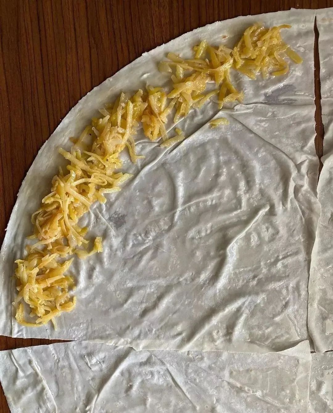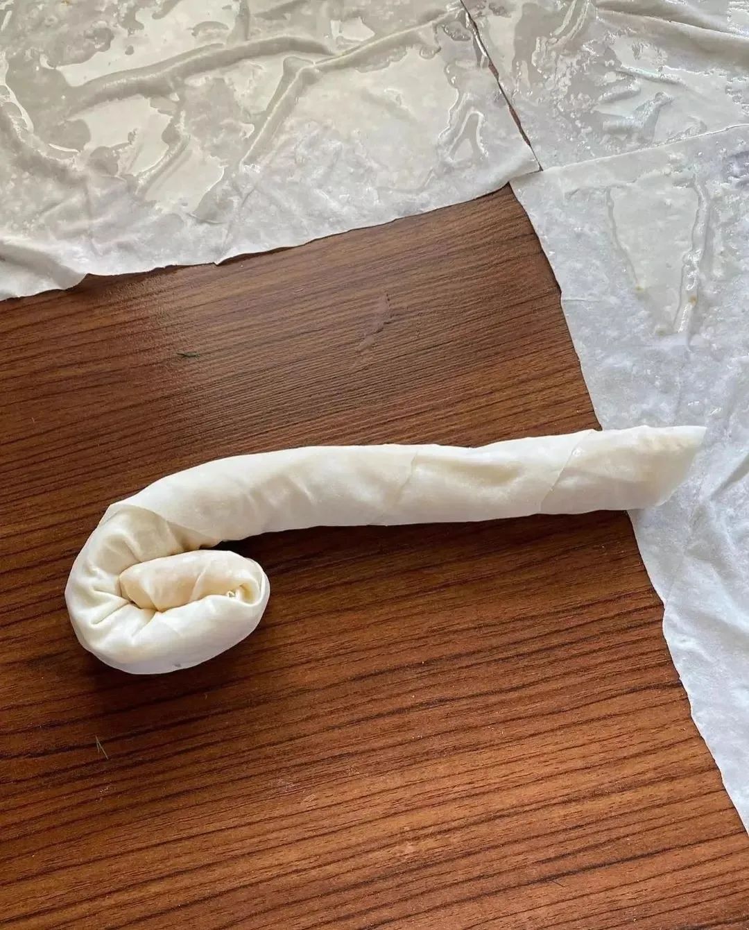 ورق خمیر یوفکا را از بسته بندی خارج کنید. اگر دوست دارید همانند عکس به صورت گرد این بورک را تهیه کنید باید خمیر گرد بگیرید و همانند عکس زیر مواد را قرار دهید و رول کنید و یا می توانید از خمیر مستطیل استفاده کنید و خمیر را به راحتی رول کنید. خمیر یوفکا را با مخلوط کمی شیر و روغن چرب کنید و از مواد میانی داخل آن قرار دهید و بپیجید.