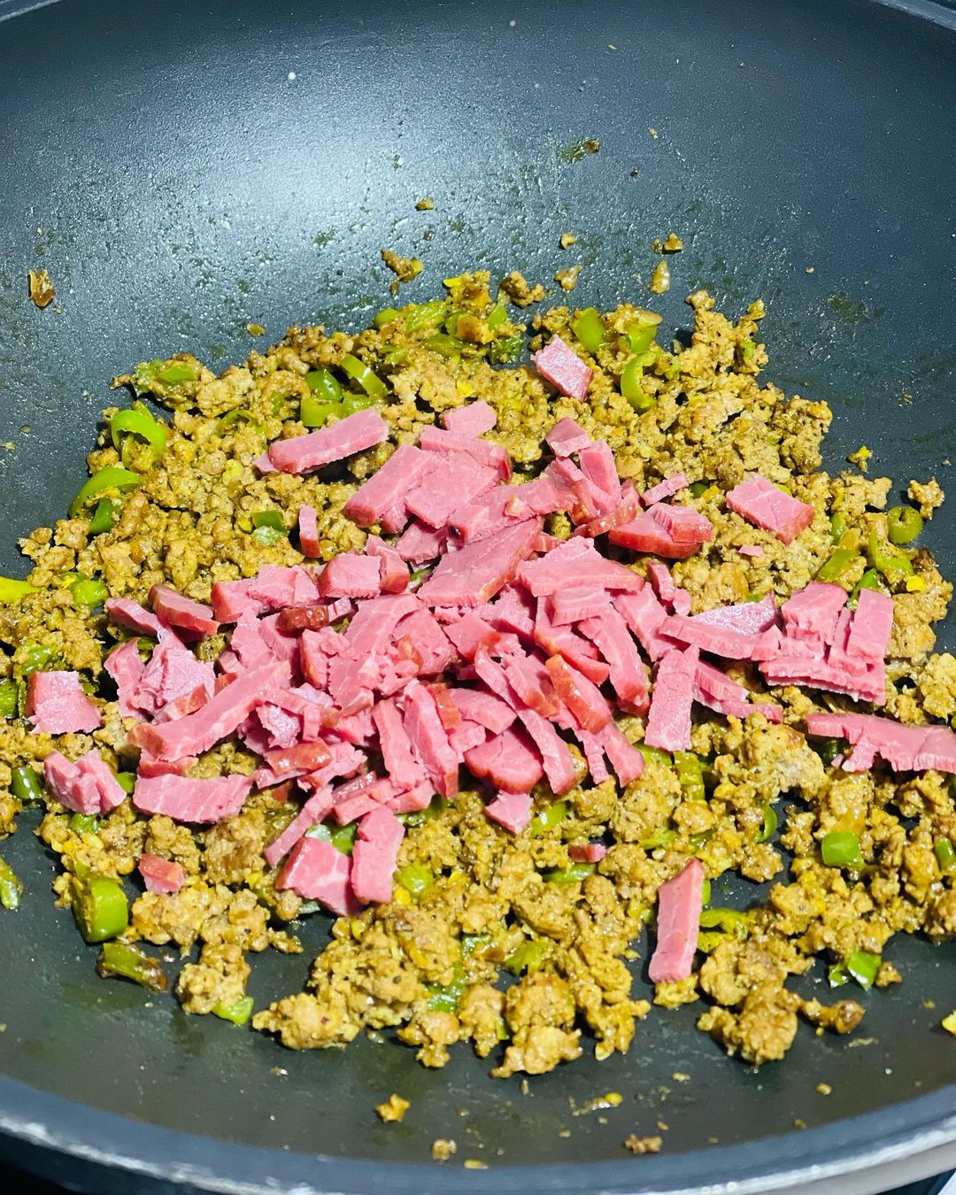 وقتی مواد یکدست شدند نوبت اضافه کردن گوشت می باشد. گوشت را اضافه کنید و خوب تفت دهید تا سرخ شود و تغییر رنگ دهد. بیکن ها را در اندازه دلخواه خرد کنید و به مواد اضافه کنید و هم بزنید تا یکدست شود و بیکن ها کمی سرخ شوند.