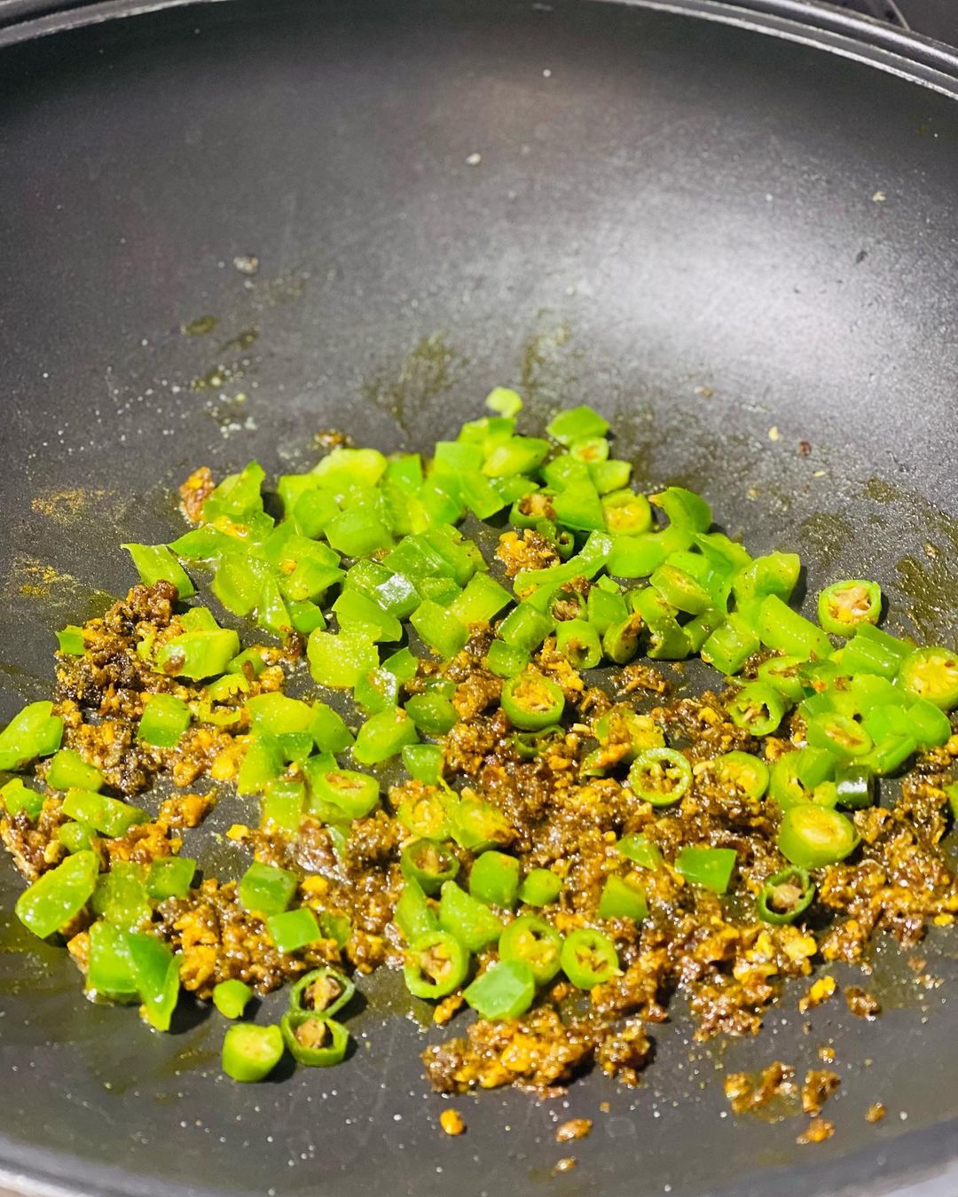 ابتدا سیر ها را پوره کنید و داخل تابه مورد نظر ریخته و کمی تفت دهید تا عطر سیر بلند شود و بعد از چند دقیقه پیاز را پوست بگیرید و نگینی ریز خرد کنید و به همراه ادویه ها و سیر کمی تفت دهید تا سبک و شیشه ای شود. سپس فلفل دلمه نگینی شده را به همراه فلفل تند اسلایس شده اضافه کنید.