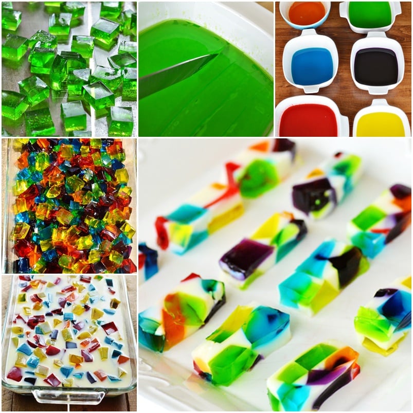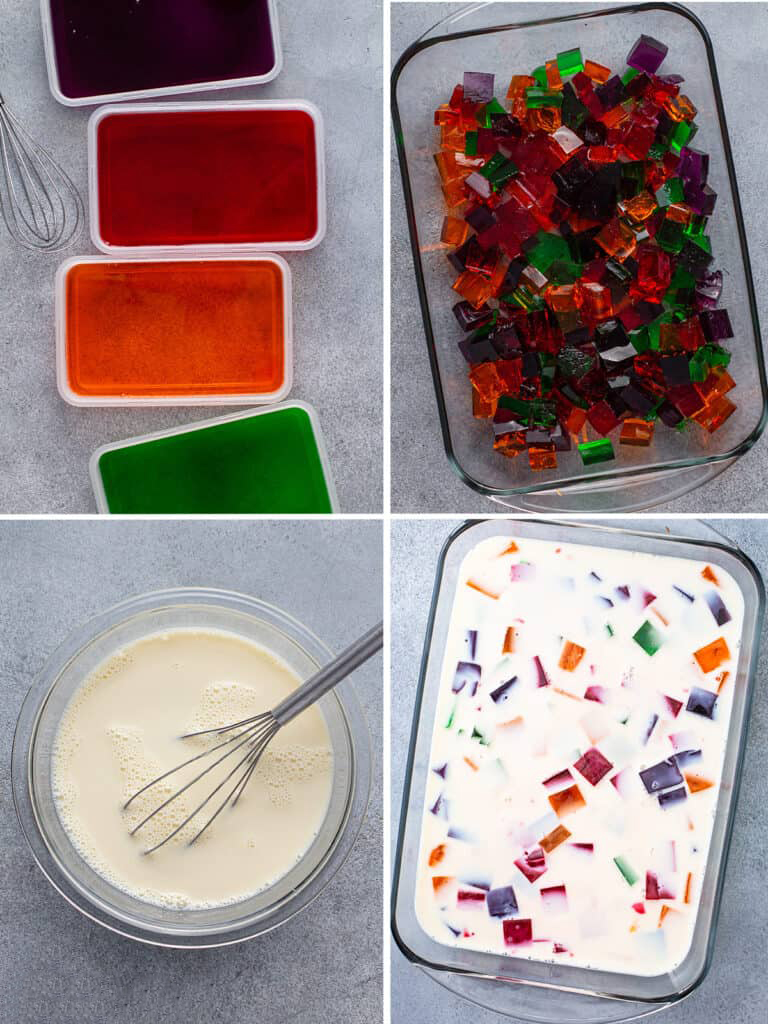 ابتدا باید از ۲ الی ۴ بسته ژله رنگی استفاده کنید که این تعداد بستگی به سلیقه شما دارد. هر بسته ژله طعم دارد باید داخل یک کاسه بریزید و به آن ها ۱.۵ پیمانه آبجوش اضافه کنید و هم بزنید تا کمی ژله حل شود و بعد بن ماری کنید و روی حرارت کتری یا به مدت ۱ دقیقه در مایکروفر قرار دهید، سپس سه ظرف مستطیل یا مربع شکل را بردارید و هر رنگ ژله را به طور جداگانه داخل آن بریزید و برای ۱ الی ۲ ساعت در یخچال قرا ردهید تا خوب خودش را بگیرد.