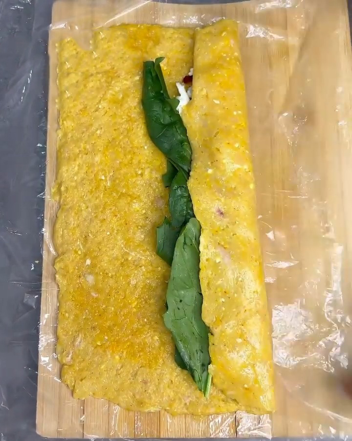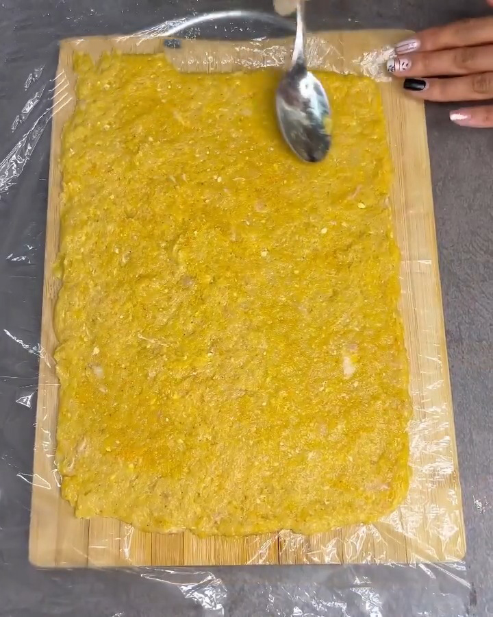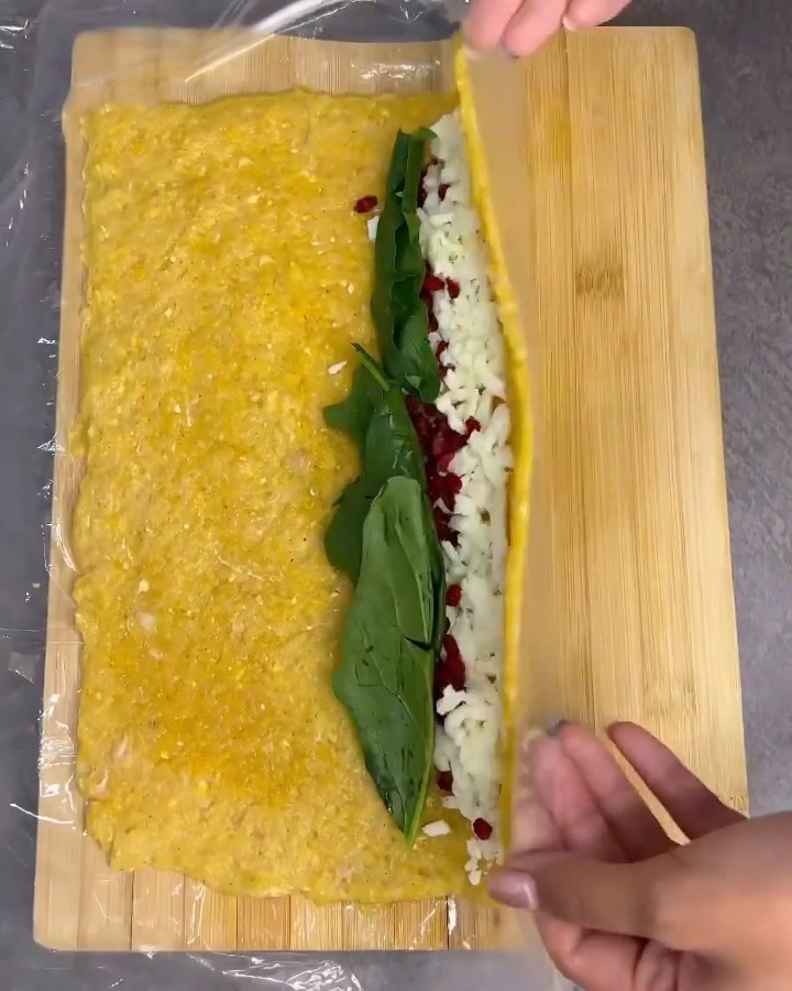 در ادامه باید یک یک تخته آشپزی را روی کابینت قرار دهید و یک نایلون را باز کنید و روی آن بگذارید و با قلمو نایلون را چرب کنید و از مواد سینه چرخ شده روی آن بریزید و به صورت مستطیل همانند تصویر باز کنید. سپس یک لایه پنیر پیتز و بعد زرشک و برگ های شسته شده و خشک شده اسفناج را قرار دهید و با کمک نایلون جوجه را رول کنید و سر و ته آن را فشار دهید تا کمی فشرده شود و با همان نایلون به مدت نیم ساعت در یخچال استراحت دهید.