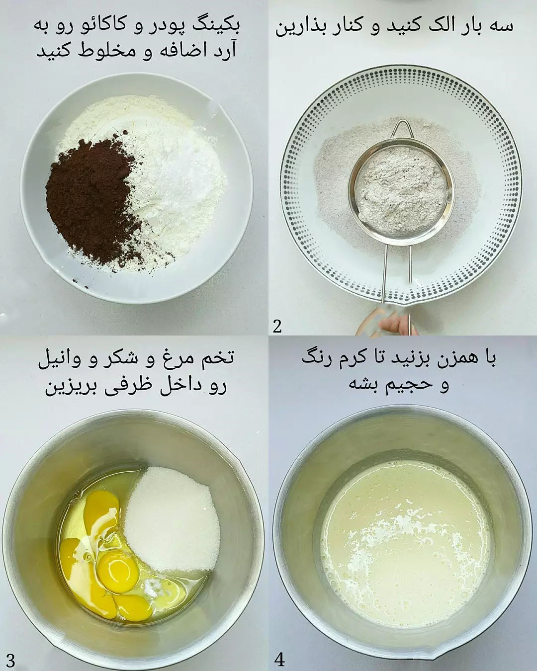 ابتدا همه مواد را در دمای محیط قرار دهید و بعد آرد و بیکینگ پودر و پودر کاکائو را باهم مخلوط و سه بار الک کنید و کنار قرار دهید و بعد تخم مرغ را به همراه وانیل و شکر را داخل کاسه بریزید و با همزن برقی بزنید تا کرمی رنگ و حجیم شود و بعد شیر و روغن مایع را به ترتیب اضافه کنید و هم بزنید.