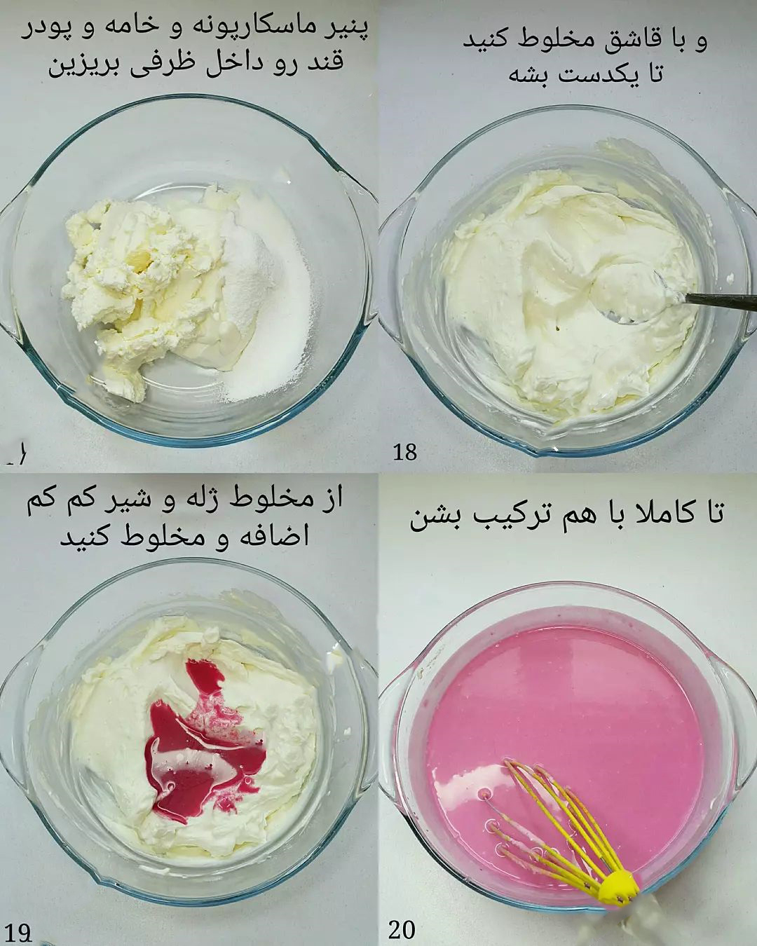کیک را بعد از خنک شدن زا قالب خارج کنید و کاغذ روغنی کف کیک را جدا کنید و اگر روی کیک پستی و بلندی دارد با کمک چاقو بگیرید و زمانی که کیک خنک شدن داخل رینگ یا قالب کمربندی قرار دهید. برای تهیه موس باید ژله ها را با آب جوش مخلوط کنید و هم بزنید و بن ماری کنید و بعد از این که ذرات ژله حل شد و خنک شد شیر را اضافه کنید و هم بزنید تا مواد مات شود. پنیر ماسکارپونه و پودر قند و خامه را داخل یک کاسه ریخته و هم بزنید تا یکدست شود و بعد کمی از مواد ژله داخل آن بریزید و هم بزنید تا مواد یکدست شود و بعد کم کم از مواد ژله اضافه کنید تا مواد باهم ترکیب شوند.