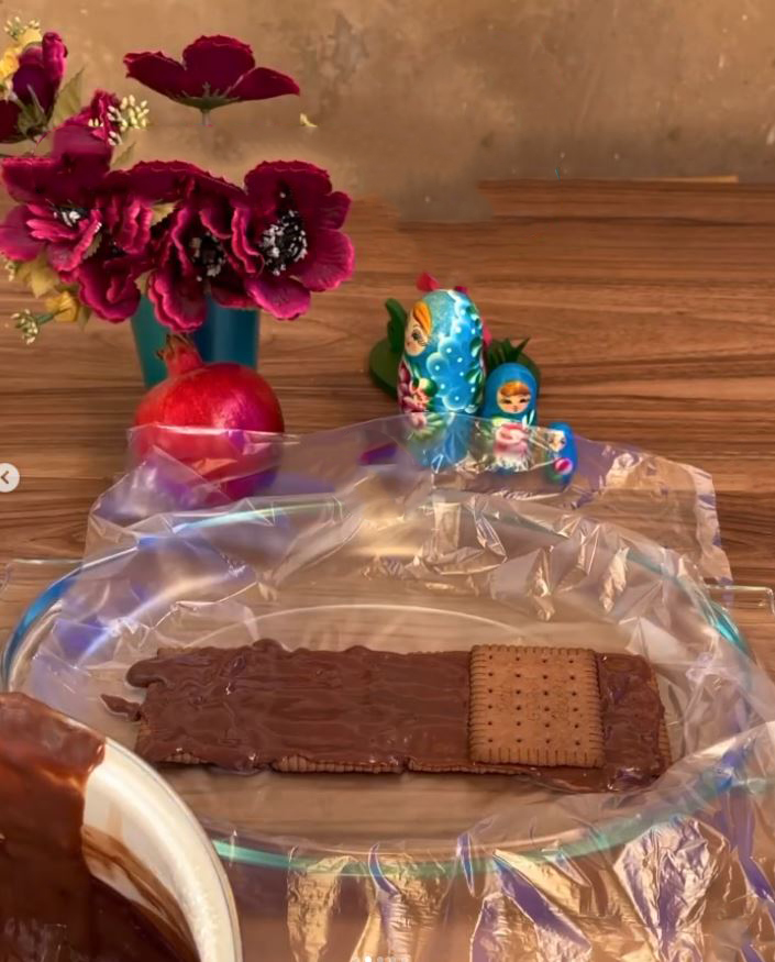 داخل یک قالب که مهم نیست از چه نوعی استفاده می کنید یک نایلون انداخته و یک ردیف بیسکویت بریزید و بعد از مواد شکلاتی مرحله قبل بریزید و همین ۴ تا بیسکویت روی هم قرار دهید و بعد کمی مواد شکلاتی این کار را برای ۱۰ لایه تکرار کنید، دقت کنید بیسکویت ها باید روی هم و در یک راستا باشند.