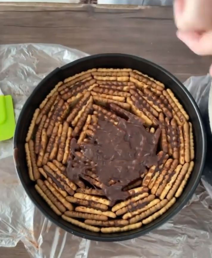 در ادامه شکلات تخته ای خرد شده را به همراه وانیل اضافه کنید و هم بزنید تا شکلات ذوب شود و بعد مواد پودینگ را از روی حرارت بردارید. داخل قالب کمربندی را بی اندازید و قالب کمر را ببندید و بعد باید همانند عکس یک ردیف ساده بیسکویت دور قالب بچینید و بعد هر بیسکویت را بردارید کمی از مواد پودینگ بزنید و به بیسکویت بچسبانید همانند عکس زیر عمل کنید و کل قالب را پر کنیدو روی دیر را با نایلون بپوشانید.