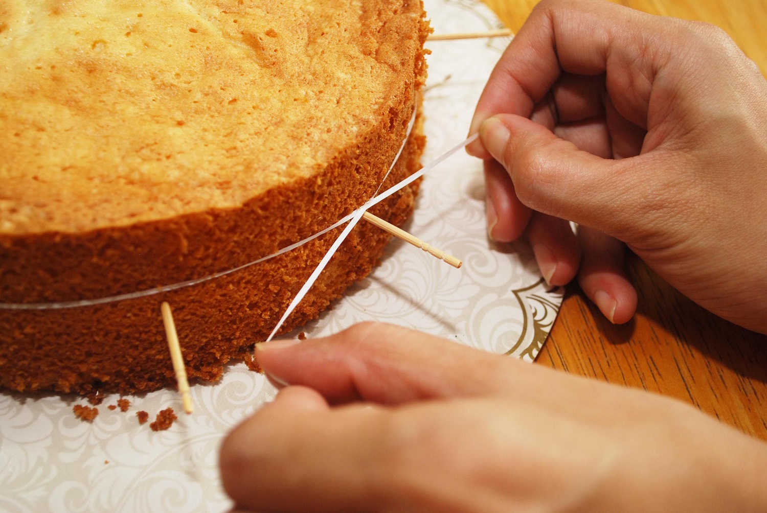 حالا یک قالب گرد سایز ۱۸ را بردارید و کف آن کاغذ روغنی قرار دهید و با روغن مایع چرب کنید و مواد را داخل آن بریزید و برای ۵۰ الی ۶۰ دقیقه داخل فر از قبل گرم شده به با دمای ۱۸۰ بگذارید تا خوب پخته شود و در انتها از فر خارج کنید و دور تا دور کیک را از قالب جدا کنید و روی توری قرار دهید. حالا ارتفاع کیک را با کمک خط کش اندازه گیری کنید و اگر ۶ سانت بود باید ۳ برش ۲ سانتی بزنید و با خلال دندان جا های که قرار است برش بزنید را علامت بزنید و یا می توانید از چاقو و یا همانند عکس از نخ استفاده کنید و لایه ها را برش بزنید.