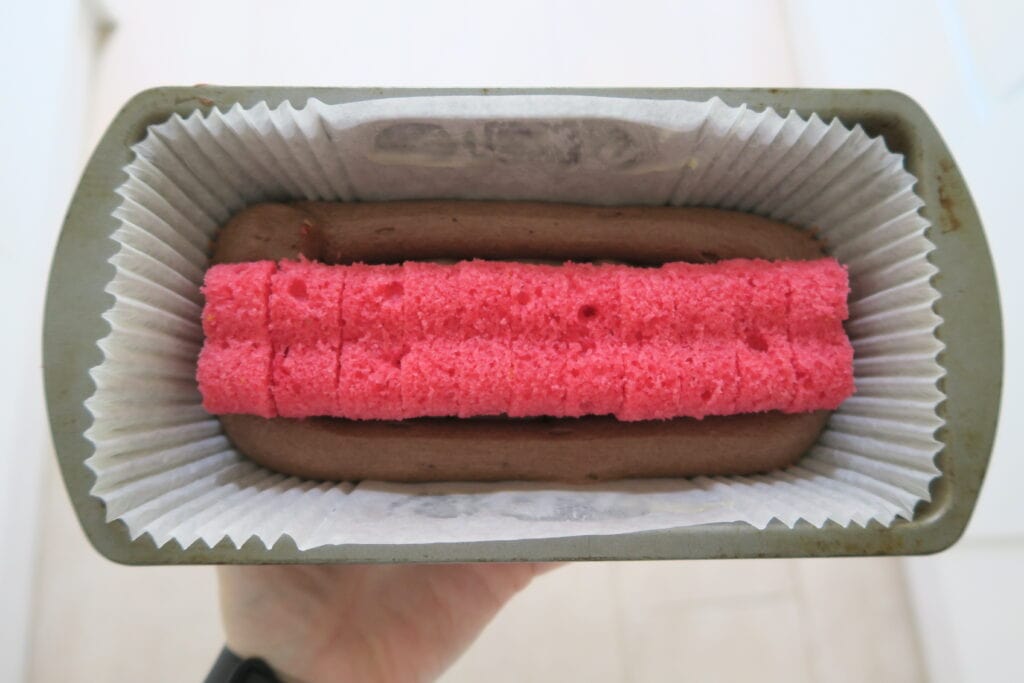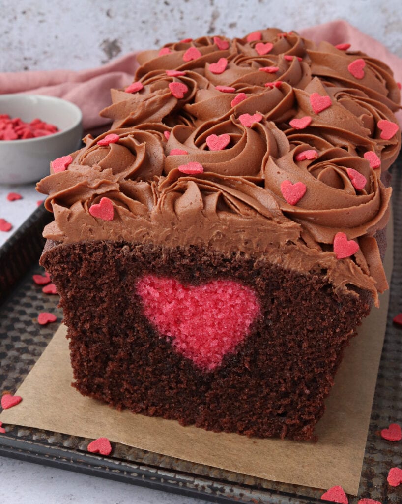 کف یک قالب ۱۷*۲۷ را باید کاغذ روغنی انداخته و مانند تصویر ۱/۳ مواد کیک شکلاتی را داخل قالب ریخته و قلب های کاتر زده را به صورت چندتایی طوری داخل مواد قرار دهید که قسمت نوک تیز قلب به سمت بالا باشد و بعد باقی مانده مواد به آرامی روی قلب ها بریزید و در فر از قبل گرم شده به مدت ۴۵ دقیقه با دمای ۱۸۰ بگذارید تا پخته شود و بعد با قلب های کاتر زده و سس شکلاتی تزیین کنید. نوش جان