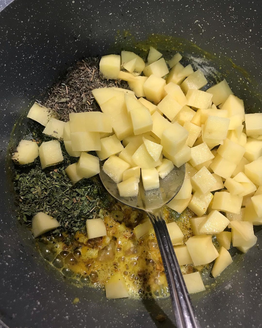 در ادامه باید سیب زمینی را پوست بگیرید و نگینی ریز خرد کنید و به همراه سبزیجات خشک گفته شده به مواد اضافه کنید و در حد مخلوط شدن هم بزنید، نیاز نیست خیلی مواد را تفت دهید وگرنه سبزیجات تلخ می شوند، ۱.۵ پیمانه آب روی مواد بریزید.