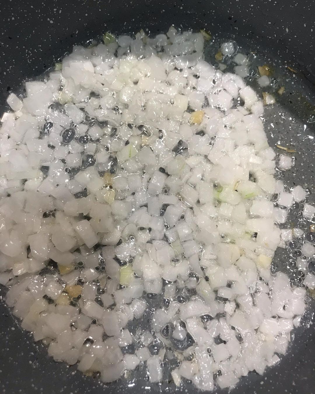 ابتدا باید پیاز را پوست بگیرید و نگینی ریز خرد کنید و داخل یک قابلمه کمی روغن یا کره ریخته و به همراه کمی زردچوبه و نمک و فلفل سیاه تفت دهید تا سبک و شیشه ای شود و بعد آرد را اضافه کنید و تفت دهید تا بوی خامی آرد گرفته شود.