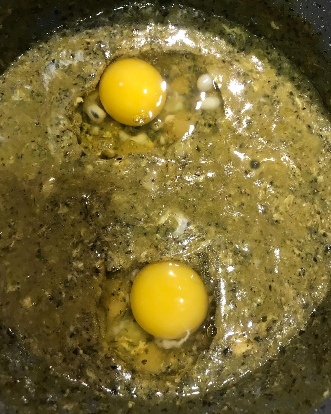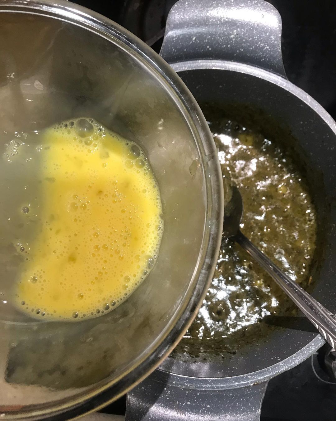 - تخم مرغی که داخل مواد زده شد برای غلظت بیشتر اشکنه استفاده شده است.