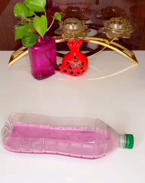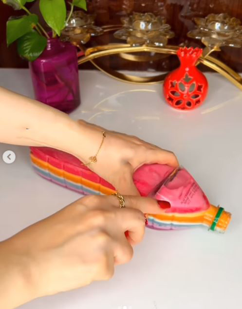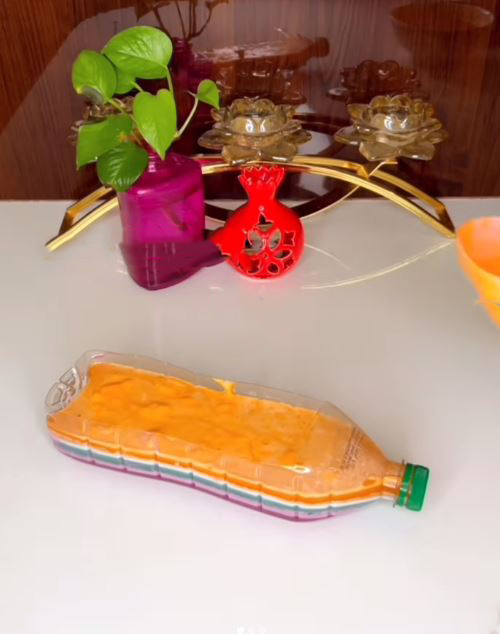 در ادامه باید یک بطری نوشابه یا آب معدنی را بردارید و با چاقو تیز بالای آن را مانند تصویر برش بزنید. حالا باید به ترتیب رنگ های ژله را بریزید و در یخچال قرار دهید و برای ۴۵ دقیقه صبر کنید تا نیم بند شود و بعد لایه ی بعدی را بریزید تا بطری پر شود.