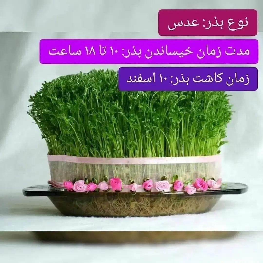 سبزه عدس: زمان ۱۰ اسفند و زمان خیس خوردن بذر ۱۰ الی ۱۸ ساعت می باشد.