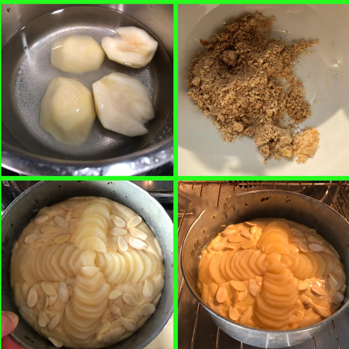 حالا باید مواد مان را داخل قالب ۲۰ سانتی چرب و آرد پاشی شده ریخته و گلابی های خنک شده را برش داده و مطابق تصویرروی مایه ی کیک قرار داده و پرک بادام روی مایه ی کیک ریخته و قالب را داخل فر از قبل گرم شده با دمای ۱۷۰ درجه ی سانتیگراد به مدت تقریبی ۴۵ دقیقه یا تا زمانیکه تستر تمیز از کیک خارج شود،می پزیم و پس از پخت و طلایی شدن،از فر خارج کرده و پس از یک ربع خنک شدن در داخل قالب،کیک را از قالب خارج کرده و شربتی را که از پخت گلابی باقی مانده بود را روی گلابی ها ریخته و سرو کنید. نوش جان