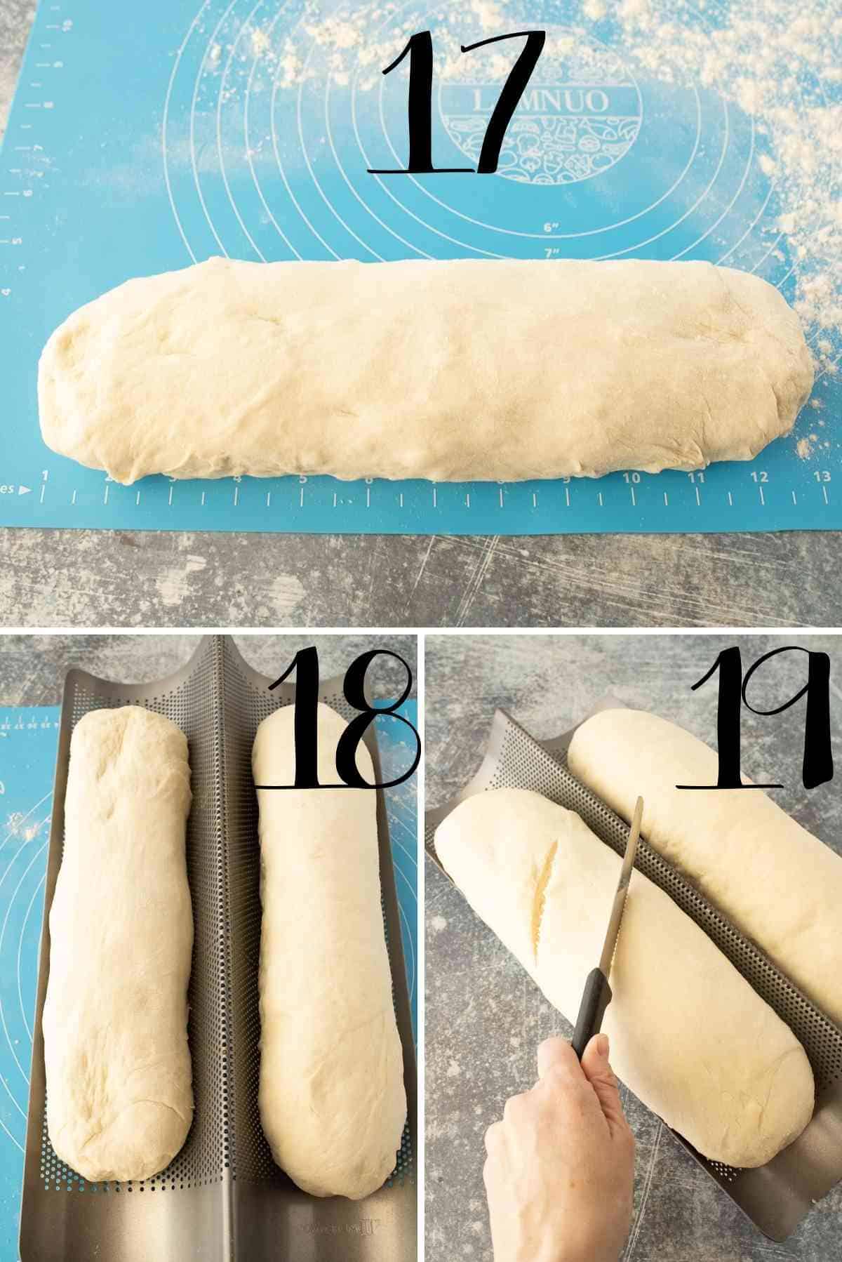 در ادامه باید خمیر حجم بگیرد و سپس سطح کار را کمی با روغن مایع چرب کرده و خمیر را روی سطح کار با دست پهن کرده و مطابق تصویر رول کنید و داخل سینی فر که که چرب و آردپاشی کردید قرار داده و روی خمیر را بپوشانید تا به مدت ۱ ساعت استراحت کرده و حجم بگیرد و سپس کمی آرد روی خمیر الک کرده و با تیغ برشگر یا نوک چاقوی تیز،سه خط روی خمیر انداخته و سینی را داخل فر از قبل گرم شده با دمای ۱۹۰ درجه ی سانتیگراد به مدت تقریبی ۳۵ دقیقه بپزید.