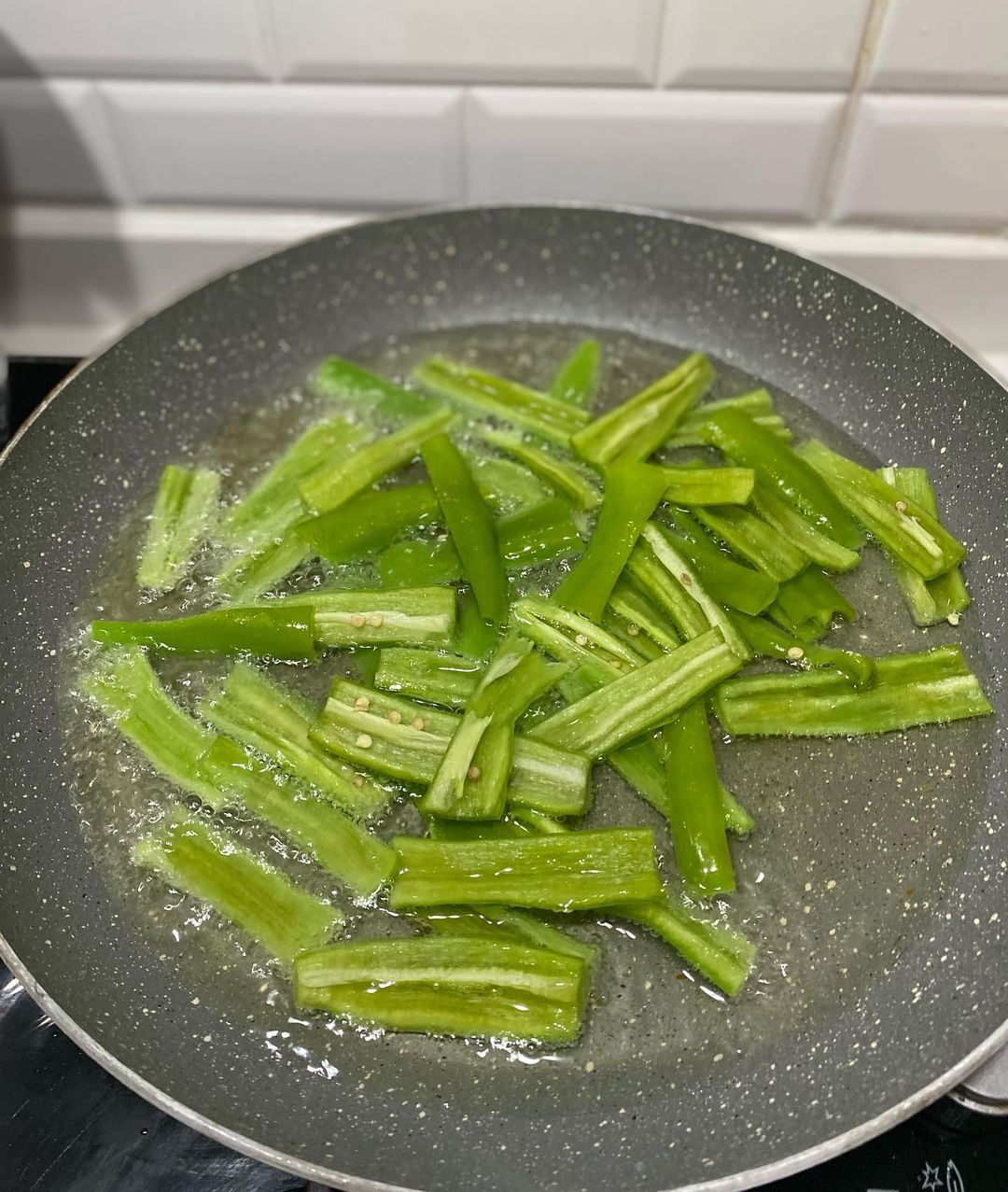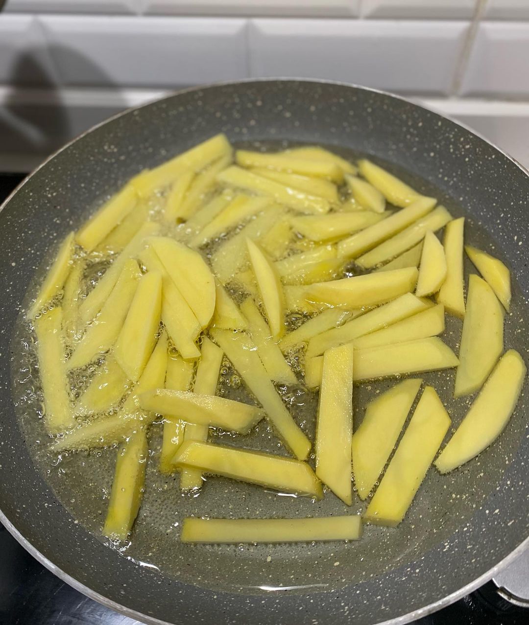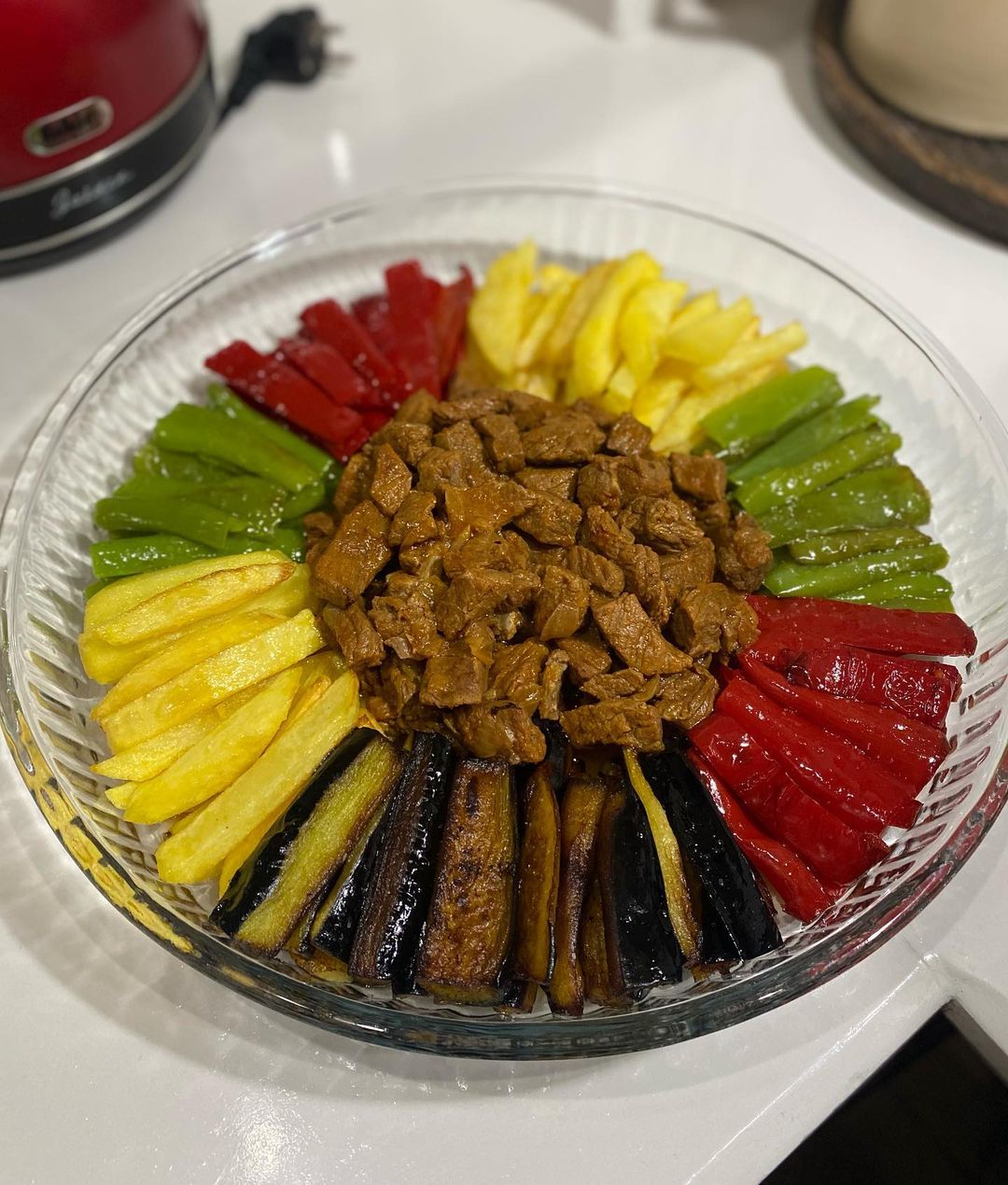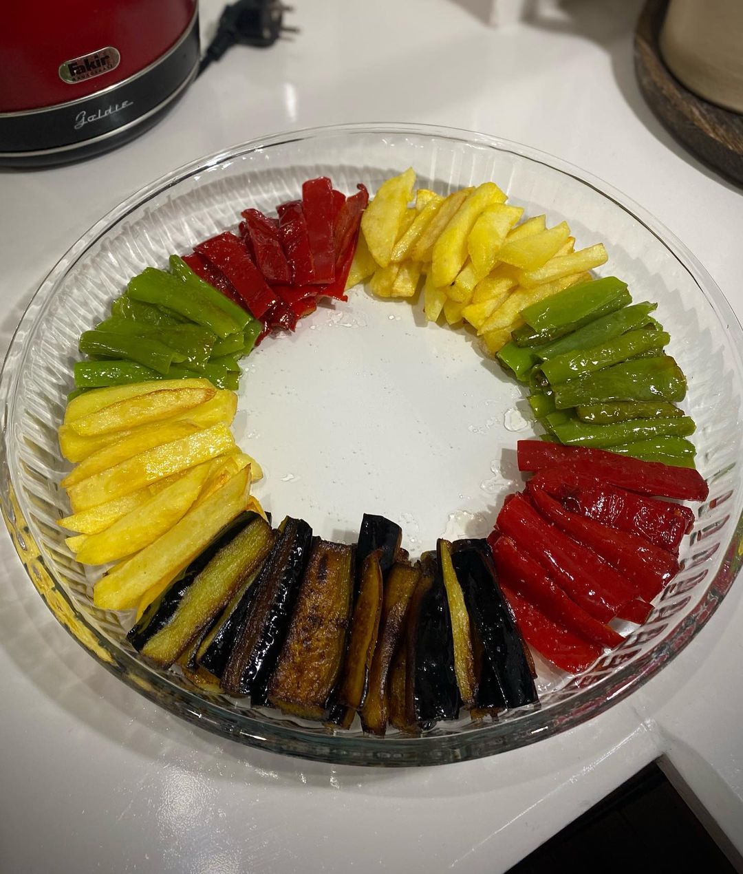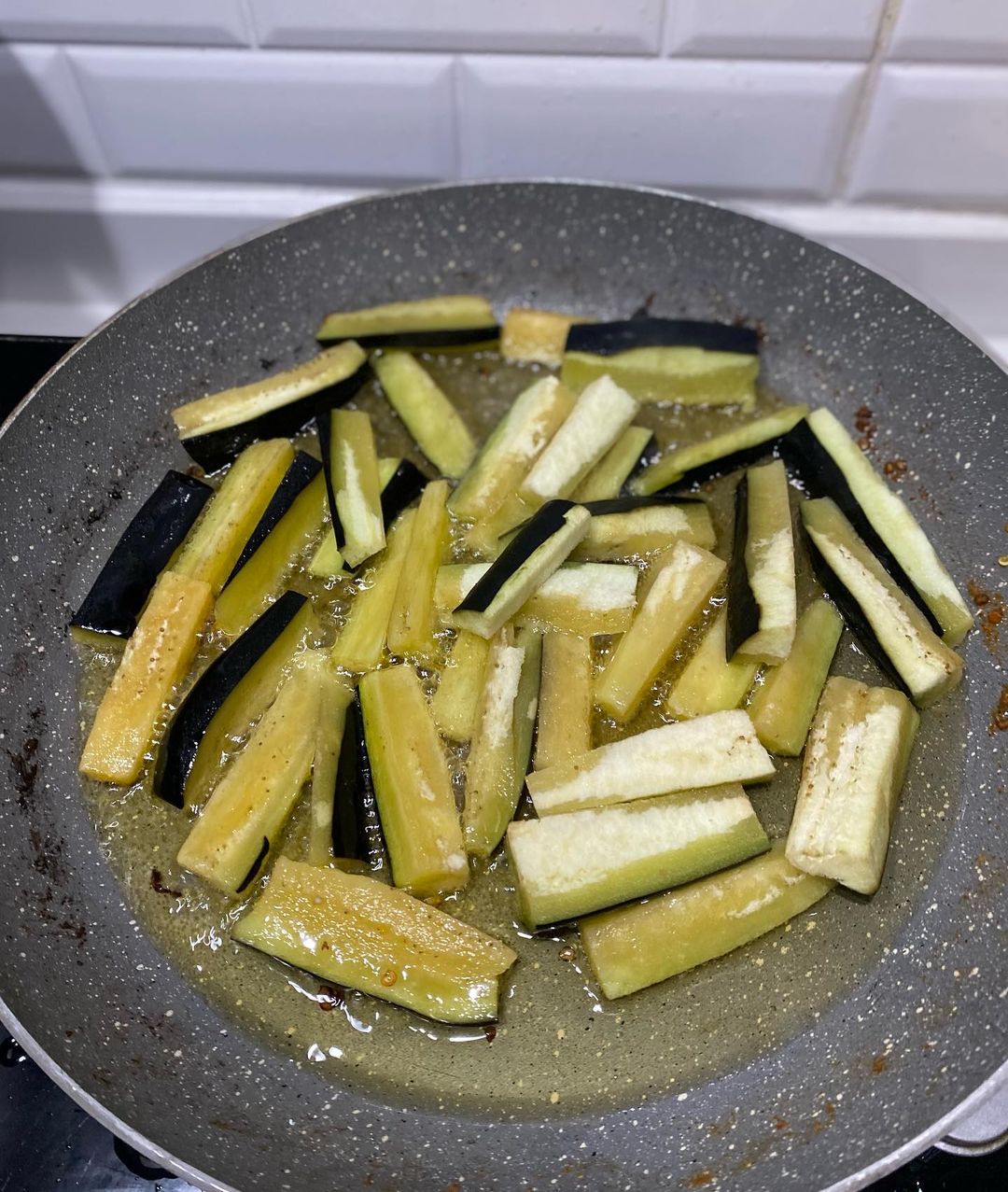 در ادامه سیب زمینی را پوست بگیرید و خلالی خرد کنید و داخل تابه سرخ کنید و بعد از تابه خارج کنید و فلفل دلمه ها را نیز به صورت خلالی برش بزنید و داخل همان تابه سرخ کنید. بادمجان را خوب بشورید و به صورت خلالی برش بزنید کمی نمک بزنید و بعد از ۱۰ دقیقه بشورید و داخل روغن سرخ کنید.