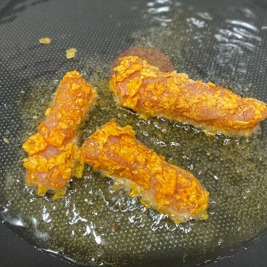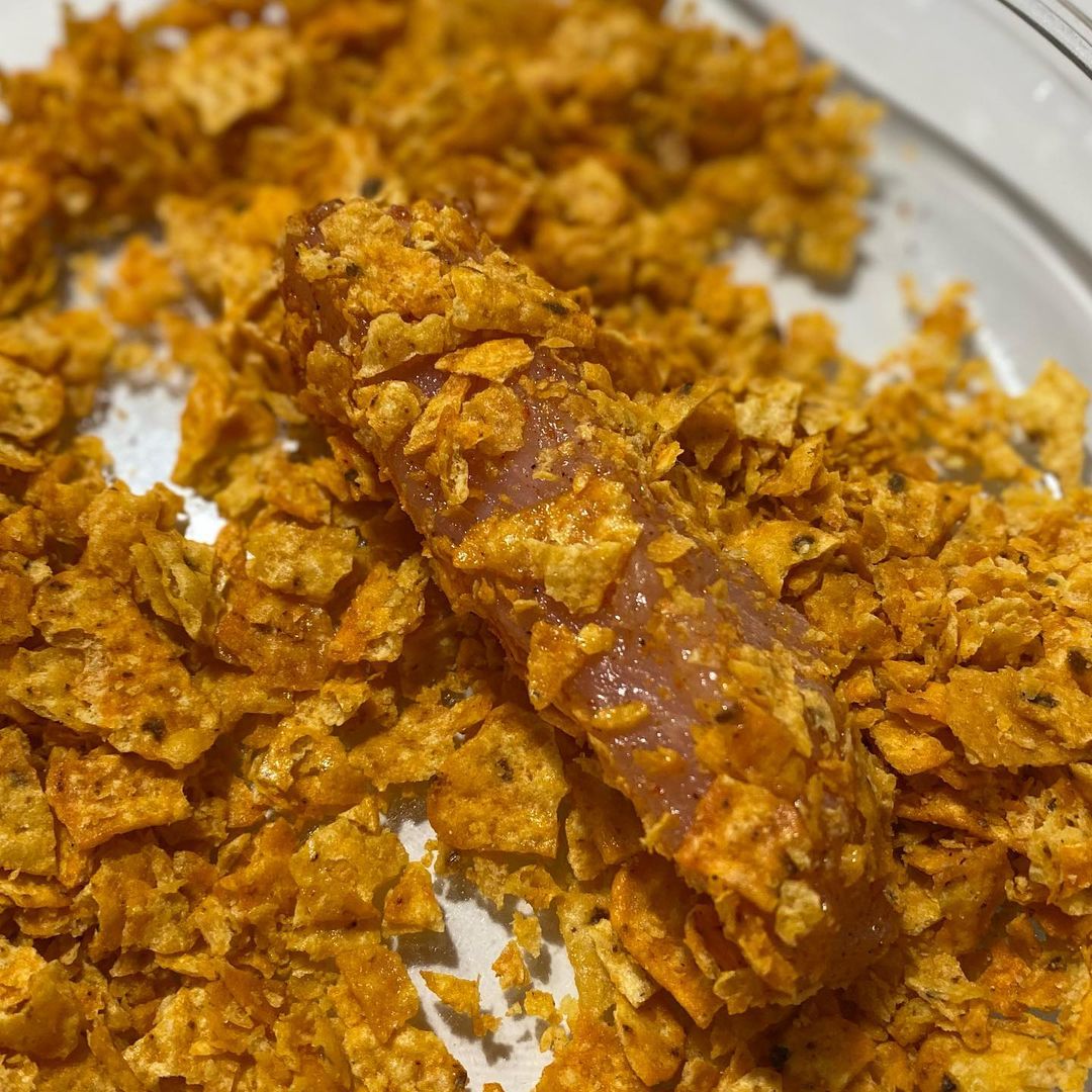 در ادامه باید چیپس تند یا مزه دلخواه خود را داخل کاسه بریزید و با دست یک گوشتکوب دستی بکوبید تا له شود نیاز نیست خیلی پودری و خرد شده و بهتر است تکه های درشتی داشته باشد و بعد مرغ های مزه دار شده را داخل چیپس خرد شده بغلطانید به طوری که همه مرغ را کاور کنید.
