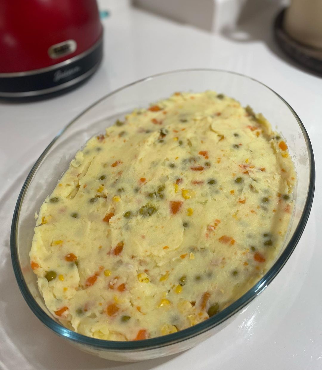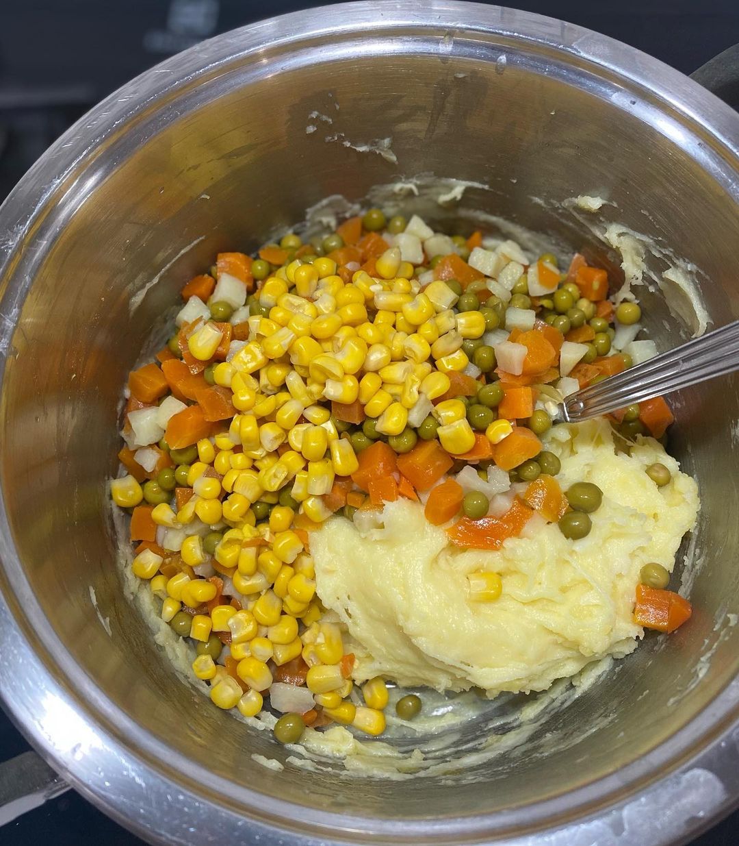 در ادامه باید سیب زمینی ها را داخل یک کاسه ریخته و به همراه کره ذوب شده خوب پوره کنید تا له شود و بعد پنیر چدار و نخود و ذرت و هویج را اضافه کنید و خوب هم بزنید تا مواد مخلوط شود، یک ظرف پیرکس را انتخاب کنید بدون چرب کردن مواد را داخل آن بریزید و با پشت قاشق روی سطح آن را خوب صاف کنید.