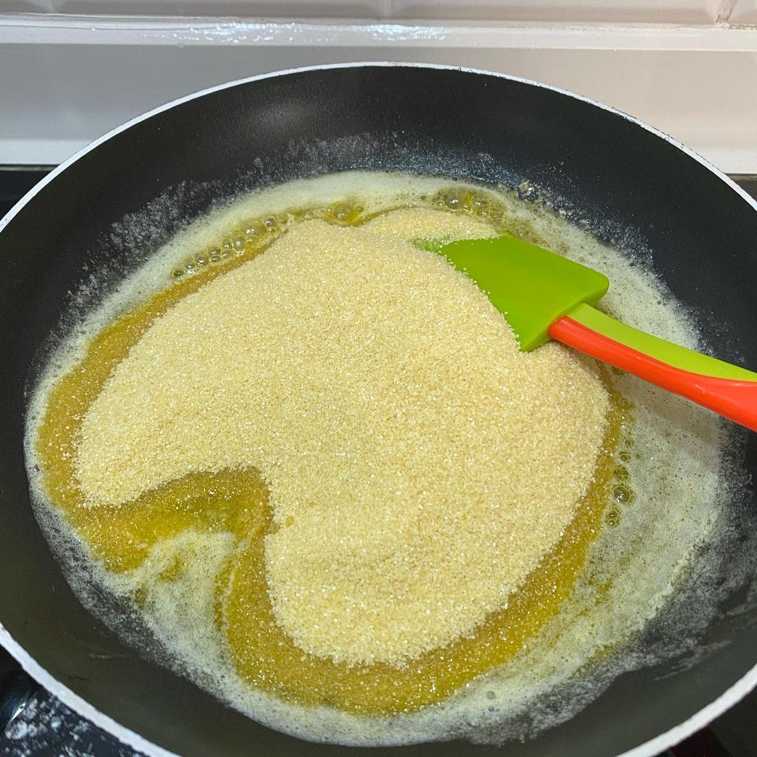ابتدا باید آرد سمولنا را تفت دهید برای این کار کره را داخل تابه ریخته و آرد را اضافه کنید و با حرارت متوسط کمی تفت دهید تا تغییر رنگ دهد ولی نباید تیره شود وگرنه حلوا بوی سوختگی به خود می گیرد. پسته ها را نیز آسیاب کنید و یا می توانید با گوشتکوب له کنید.