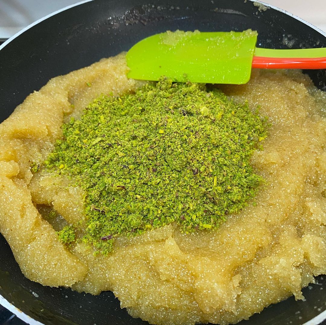 در ادامه باید پسته خرد شده را به آرد سمولینا اضافه کنید. و هم بزنید تا مواد مخلوط شود و بعد شربت داغ را اضافه کنید و هم بزنید تا شربت کم کم جذب مواد شود و و آب اضافه آن از بین برود و حلوا وسط قابلمه یا تابه جمع شود و برای اطمینان درب قابلمه را قرار دهید تا آب اضافه تبخیر شود و وقتی چک کردید آب را به خوبی جذب کرد از مواد بردارید با دست شکل دهید و روی آن پودر پسته بپاشید و سرو کنید. نوش جان