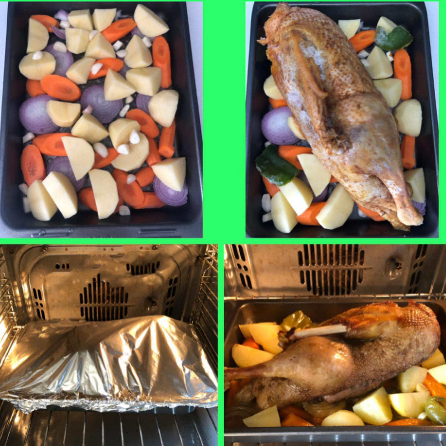 سبزیجات شامل پیاز حلقه شده و هویج خرد شده و سیب زمینی درشت خرد شده و حبه های سیر و فلفل دلمه ای خرد شده را ریخته و گوشت غاز را روی سبزیجات قرار داده و دو لیوان آب داخل ظرف ریخته و کمی زعفران روی گوشت غاز ریخته و روی ظرف را با فویل یا کاغذ روغنی مرطوب بپوشانید.