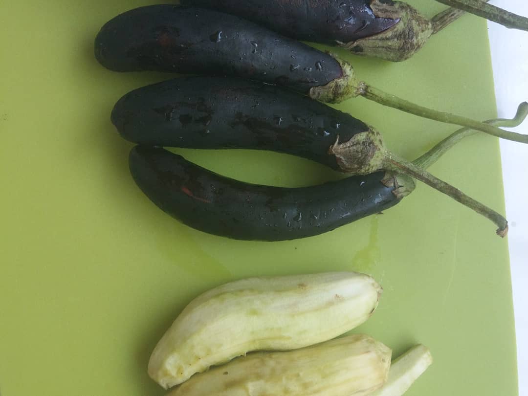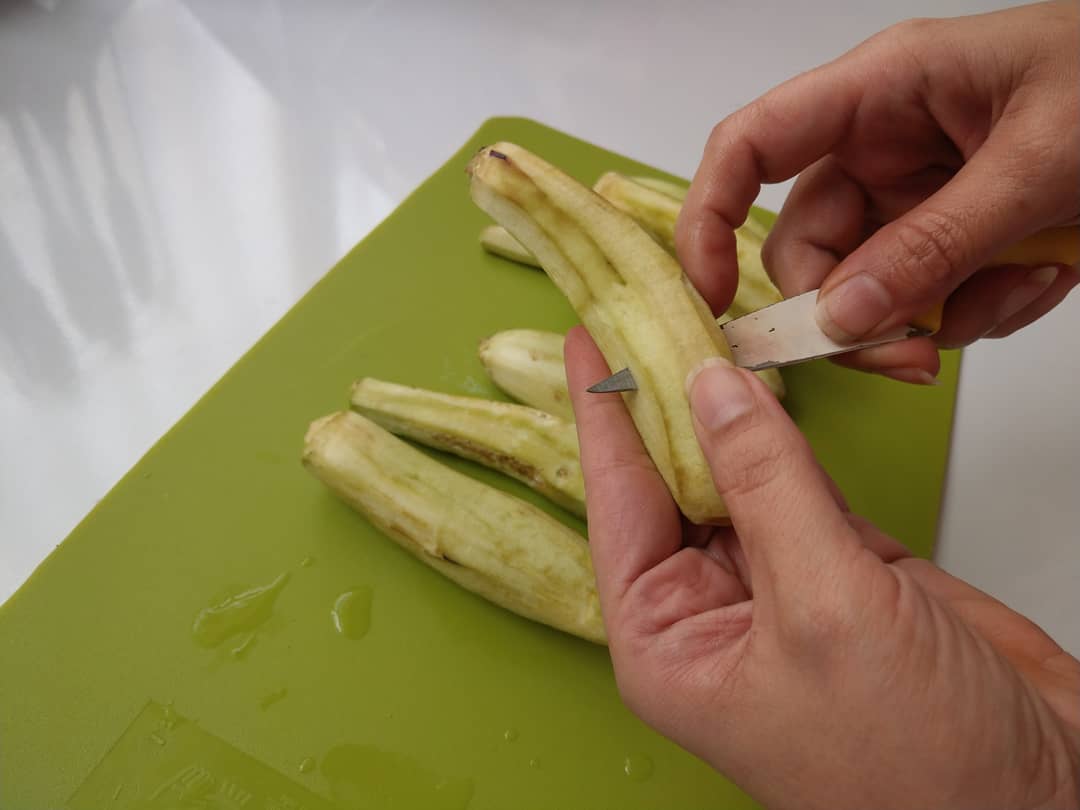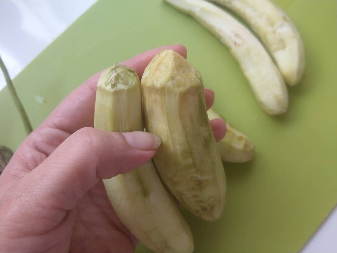اول از همه بادمجون ها را پوست بکنید و دقت کنید سر کلاهک آن را از ته نزنید یه کمی از سر کلاهک را گرد و کوچولو نگه دارید که در فرایند پختن له نشوند و در انتها برای تزیین روی بادمجان ها قرار دهید و بعد یک کارد تیز یکی دو تا شکاف خیلی کوچک داخل بادمجان ایجاد کنید تا موقع پخت شیره کامل داخل آن برود و موقع گرفتن تلخی کاملا تلخی آن خارج شود.