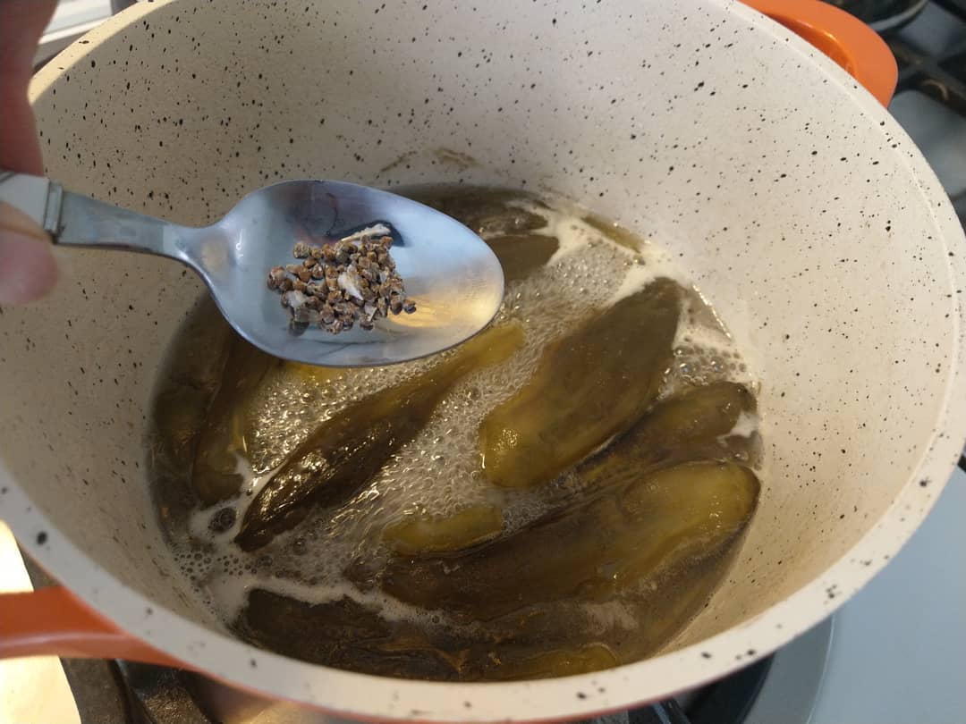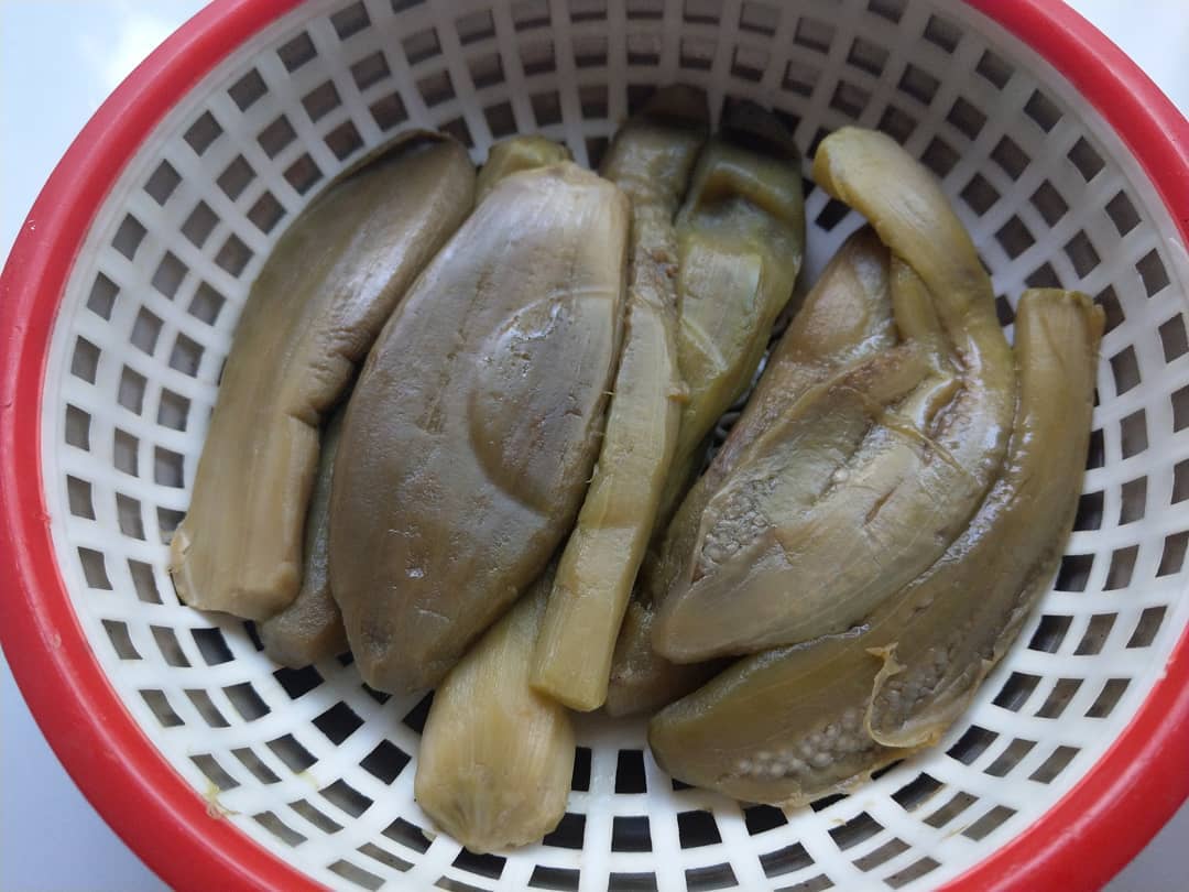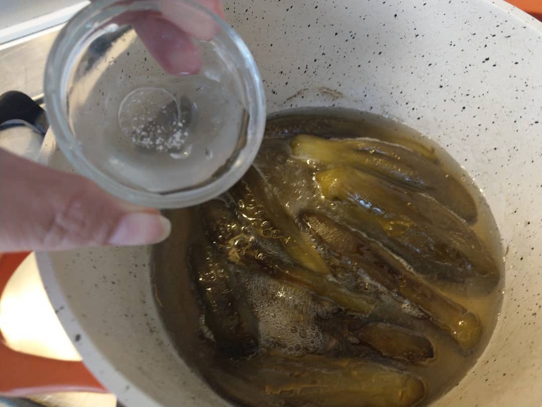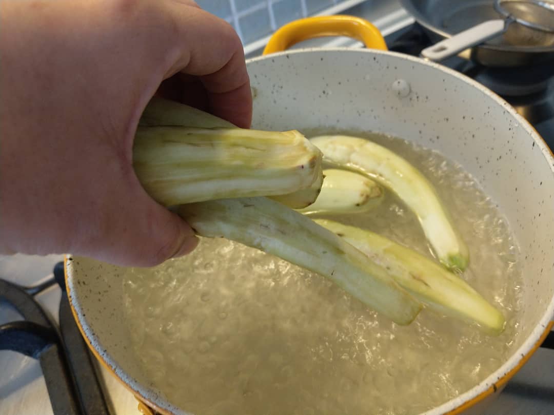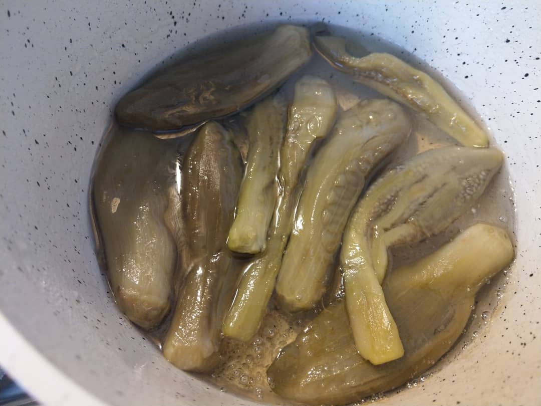 در ادامه باید داخل یک قابلمه آب بریزید و بگذارید تا جوش بیاید و حالا بادمجان ها را داخل آب قرار دهید و برای ۱۰ دقیقه بگذارید تا بادمجان ها پخته شوند ولی دقت کنید خیلی له نشوند و حالت خود را از دست ندهند و بعد بادمجان ها را آبکش کنید و داخل یک کاسه بریزید و آب خیلی سرد روی آن ها بریزید و برای ۵ الی ۶ ساعت بگذارید تا بادمجان ها داخل آب سرد و یخ بماند. در این زمان حتما چندین بار آب را عوض کنید و در انتها یک سبد و یا جسم سنگین روی آن قرار دهید تا کمی به بادمجان ها فشار بیاید و زهرابه آن کاملا خارج شود.