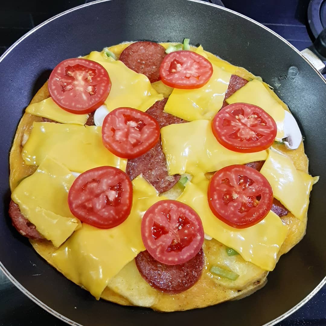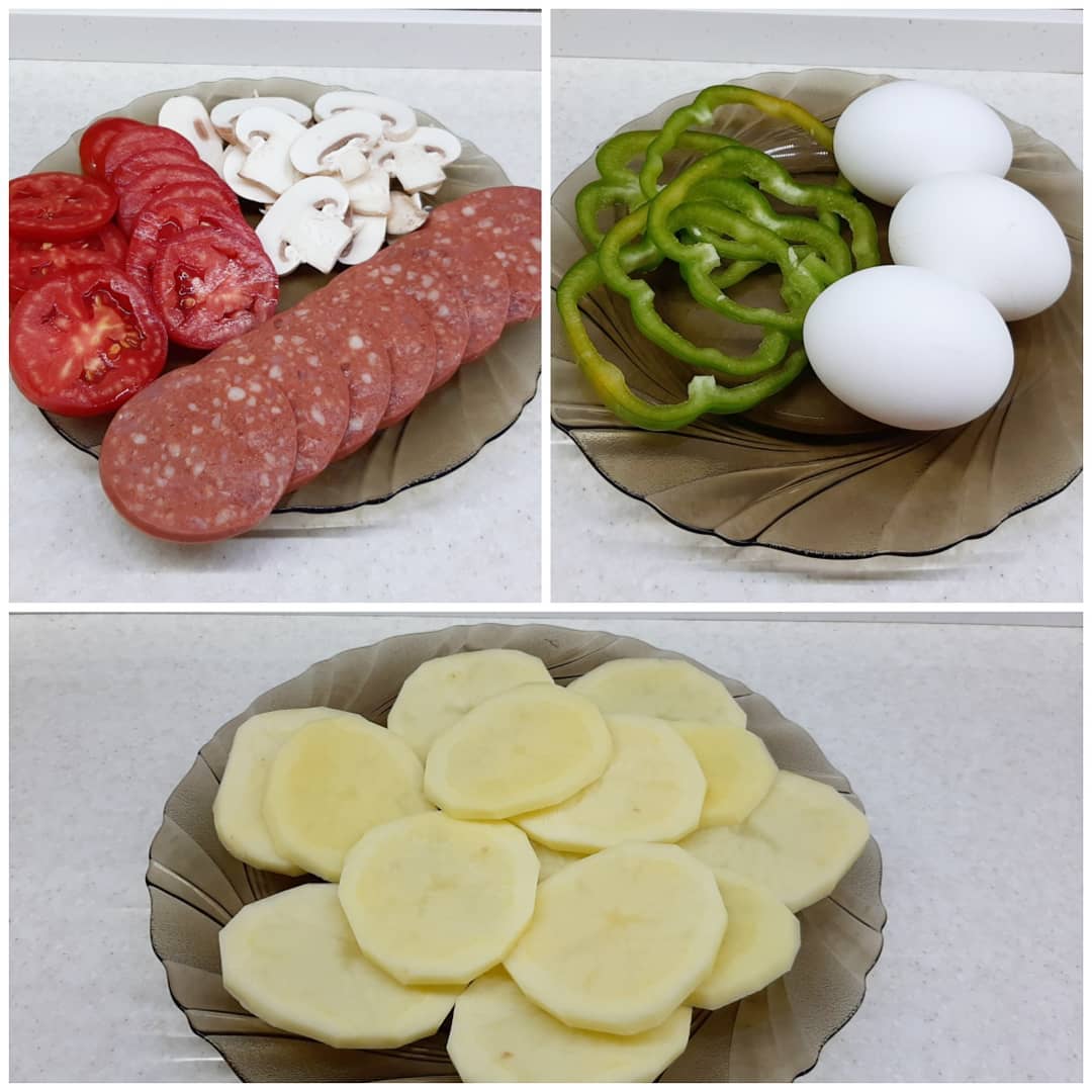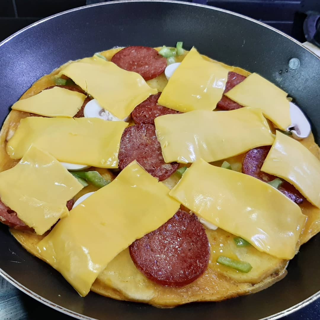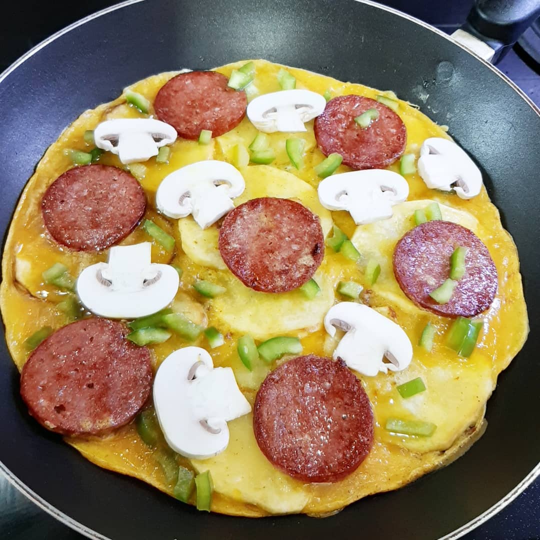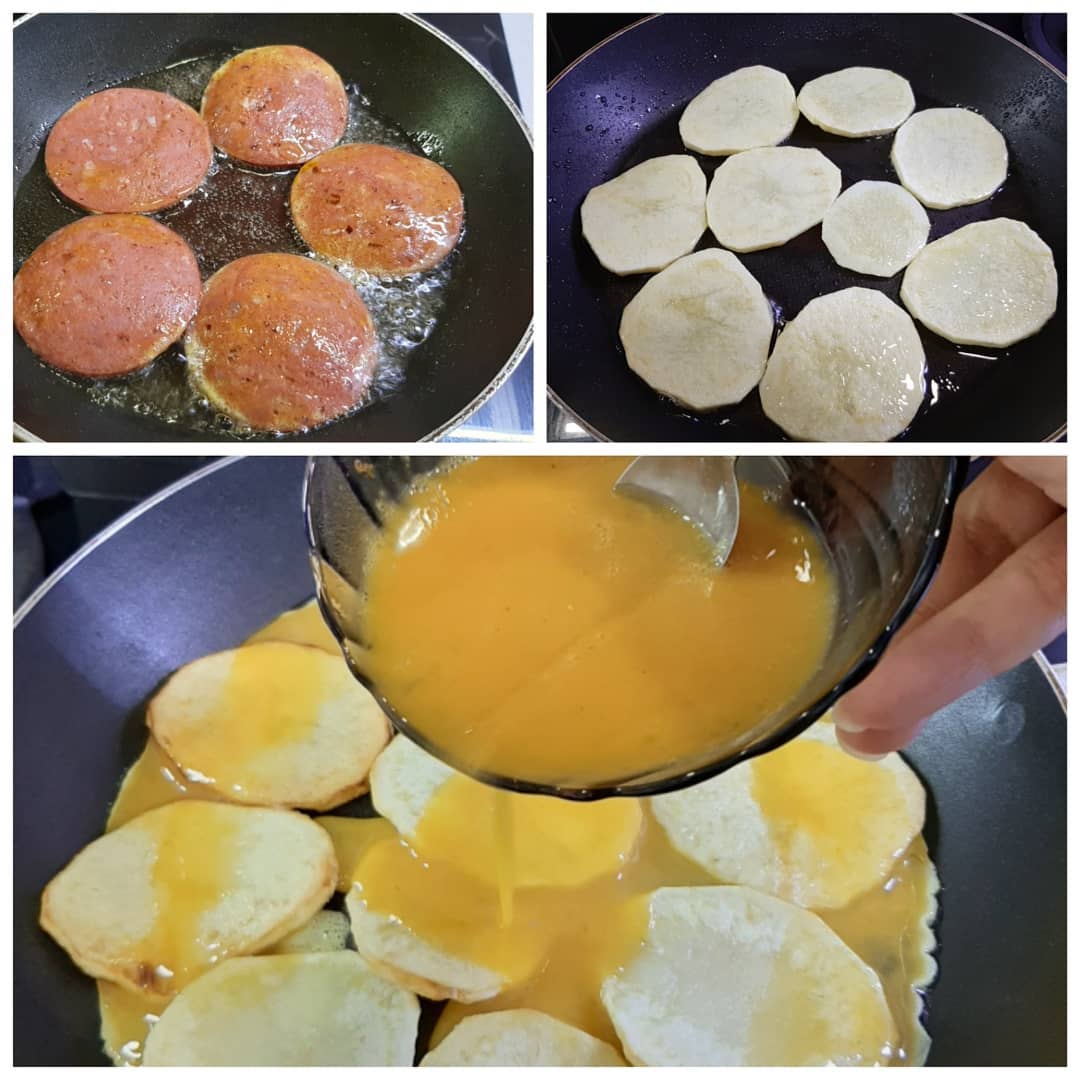 در ادامه باید سیب زمینی ها سرخ شده را داخل تابه بچیند. تخم مرغ ها را با همزن دستی بزنید تا از لختگی خارج شود و بعد کمی نمک و فلفل سیاه بزنید و روی سیب زمینی ها بریزید و بعد به ترتیب سوسیس و گوجه و قارچ و فلفل دلمه را اضافه کنید و در این مرحله می توانید از پنیر ورقه ای یا رنده شده استفاده کنید و درب تابه را قرار دهید تا خودش را بگیرد و زمانی که کاملا تخم مرغ پخته و پنیر ذوب شد از روی حرارت بردارید و با سس دلخواه سرو کنید. نوش جان