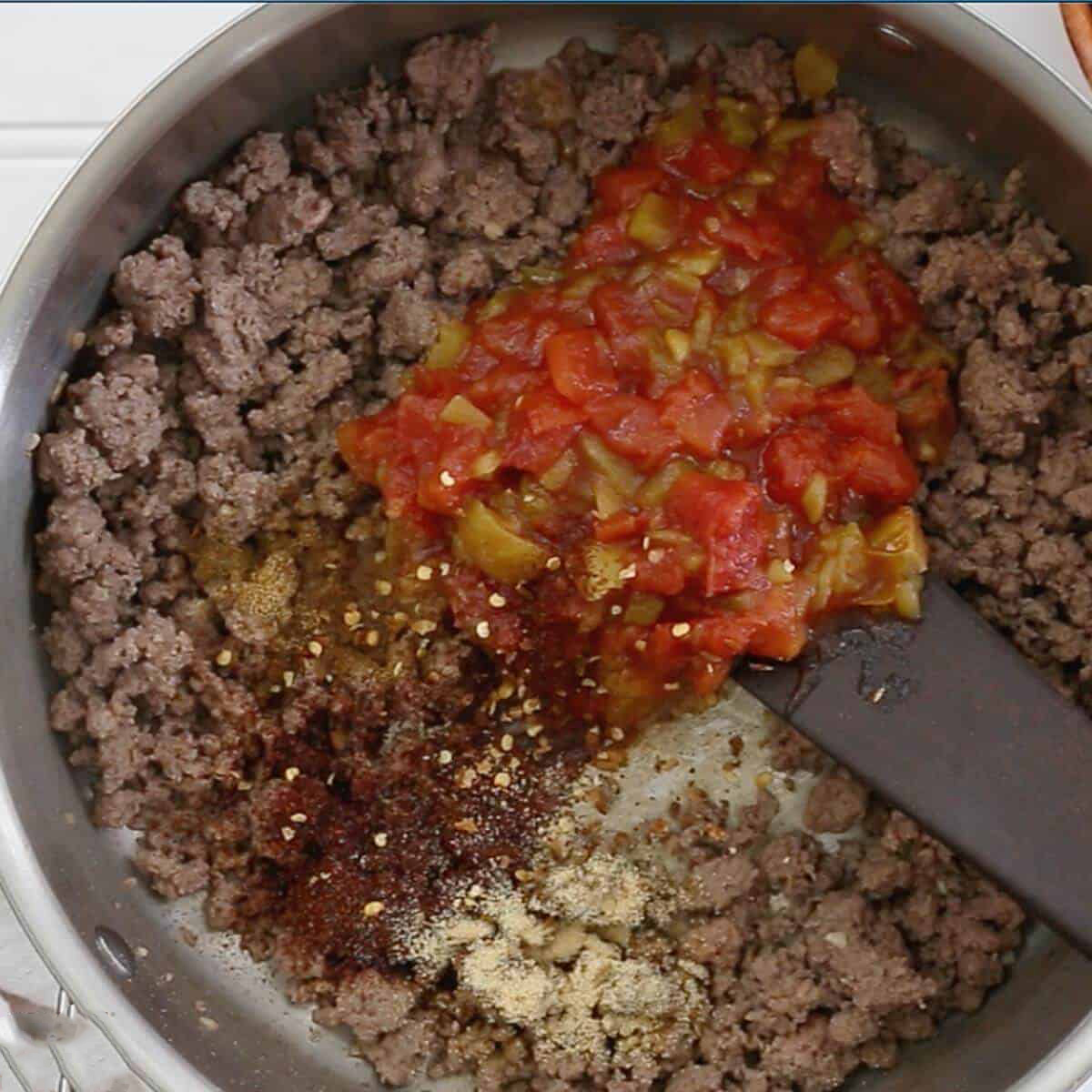 در ادامه باید گوجه فرنگی را پوره یا نگینی ریز خرد کنید و به گوشت اضافه کنید و روی حرارت برای ۱۰ دقیقه با شعله متوسط قرار دهید تا آب اضافه گوجه فرنگی کشیده و نرم شود.