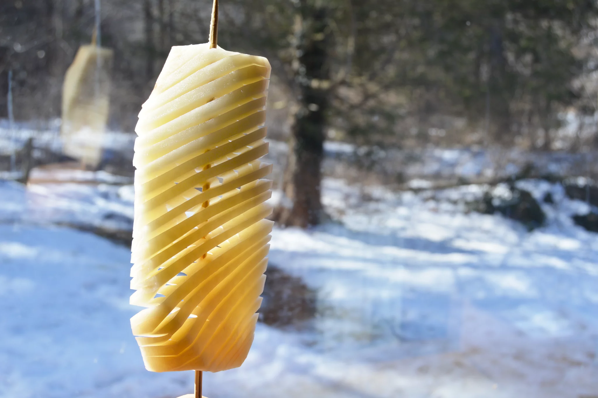 در ادامه باید برش سیب زمینی را بین دو سیخ قرار داده و با کمک چاقو یک اندازه .و با فاصله کم برش بزنید به طوری که نباید خیلی عمقی باشد و بعد سیب زمینی را برگردانید و بین دو سیخ قرار دهید و به صورت اوریب حالا برش بزنید و بعد مشاهده می کنید که سیب زمینی شبیه به فنر شده است. حالا باید سیب زمینی را روی یک پارچه نخی قرار دهید و حسابی خشک کنید.