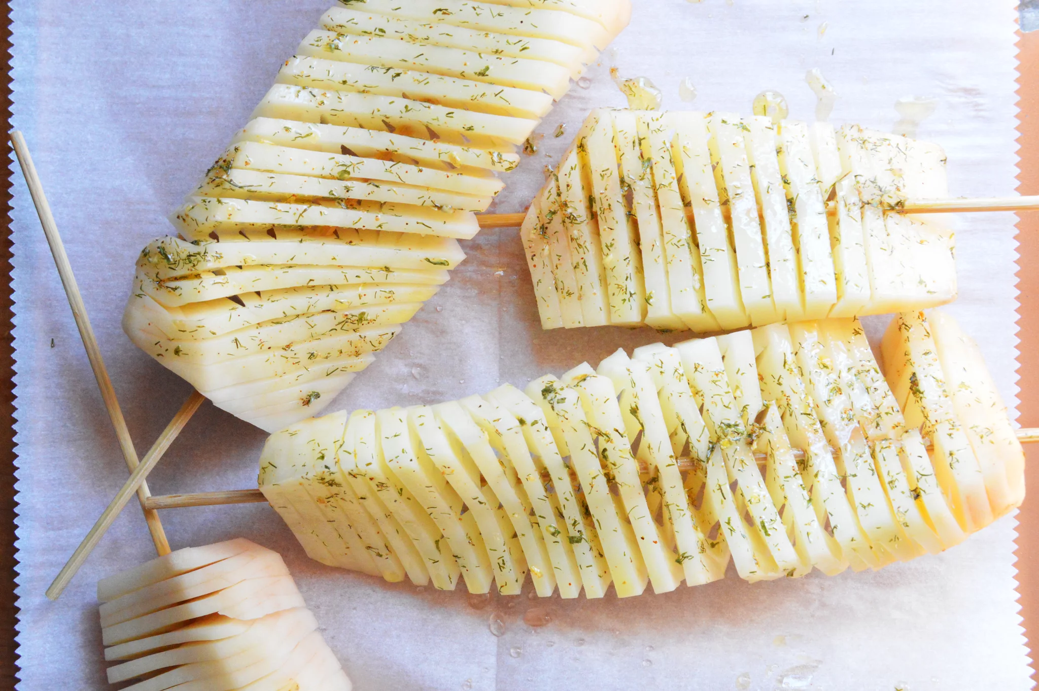 ابتدا باید سیب زمینی ها پوست بگیرید و بشورید و به صورت قطور برش بزنید و هر برش را باید بین دو سیخ چوبی قرار دهید. بهتر سیب زمینی را بعد از برش زدن داخل آب قرار دهید تا نشاسته اضافی آن از بین برود.