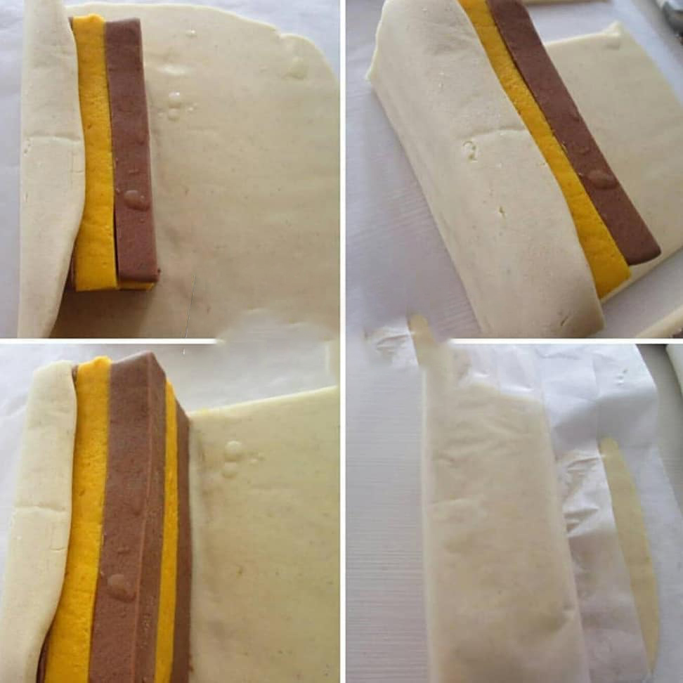 در صورت خشک بودن هر یک از حلواهای چرخ شده، کمی کره یا روغن مایع به آن قسمت از حلوا اضافه کنید تا نرم شود. حلوای سفید را به ضخامت دو تا سه میلی متر بین دو ورق کاغذ روغنی با کیسه فریزر با وردنه پهن کنید. دو حلوای دیگر را (زرد و قهوه ای)جداگانه به ضخامت یک سانتی متر باز کنید؛ سپس آن را به صورت نوارهای بلند، به عرض یک سانتی متر برش دهید. قسمت وسط حلوای سفید را با برس، گلاب یا آب بزنید تا مرطوب شود.